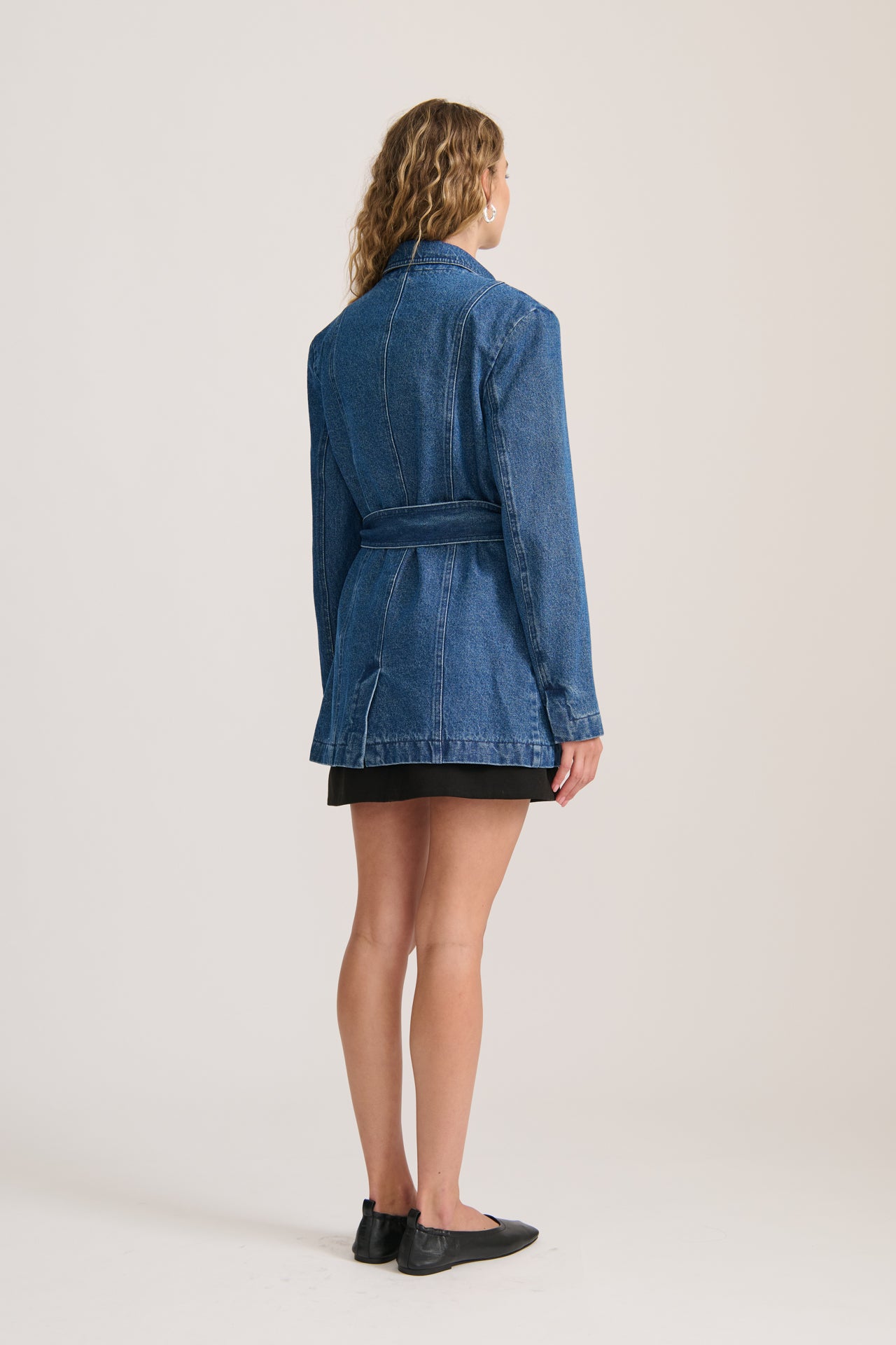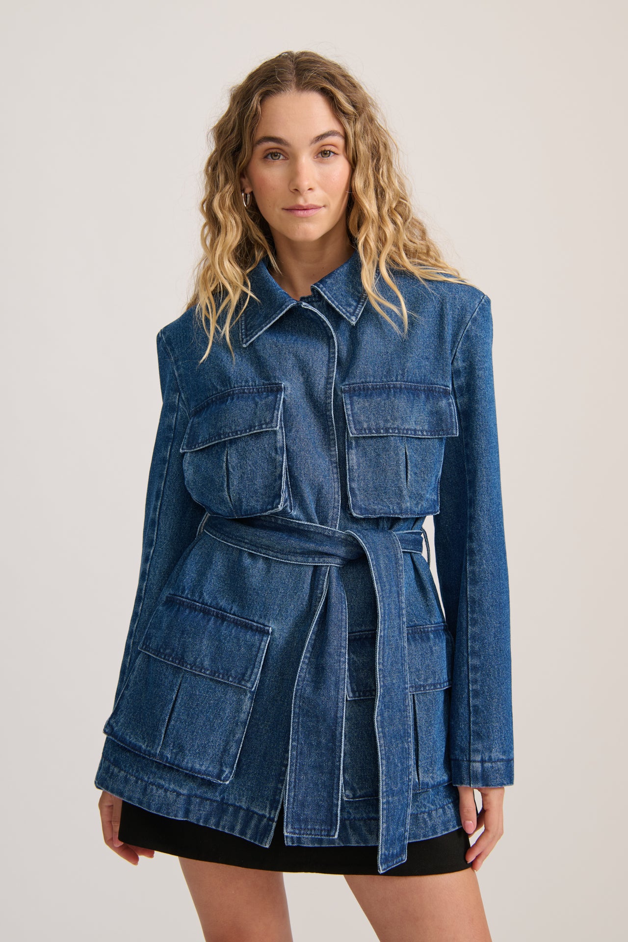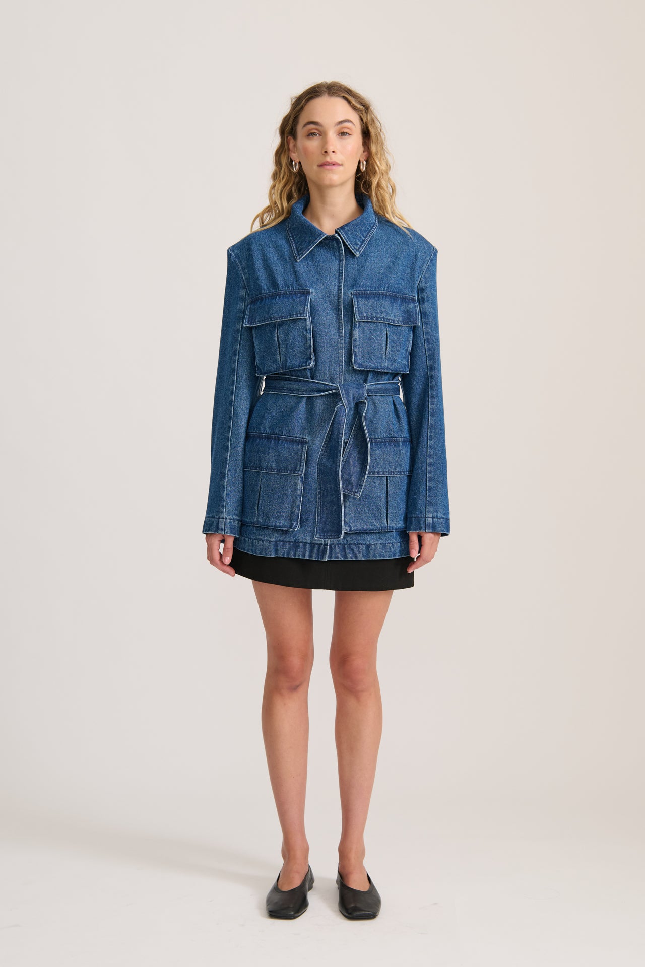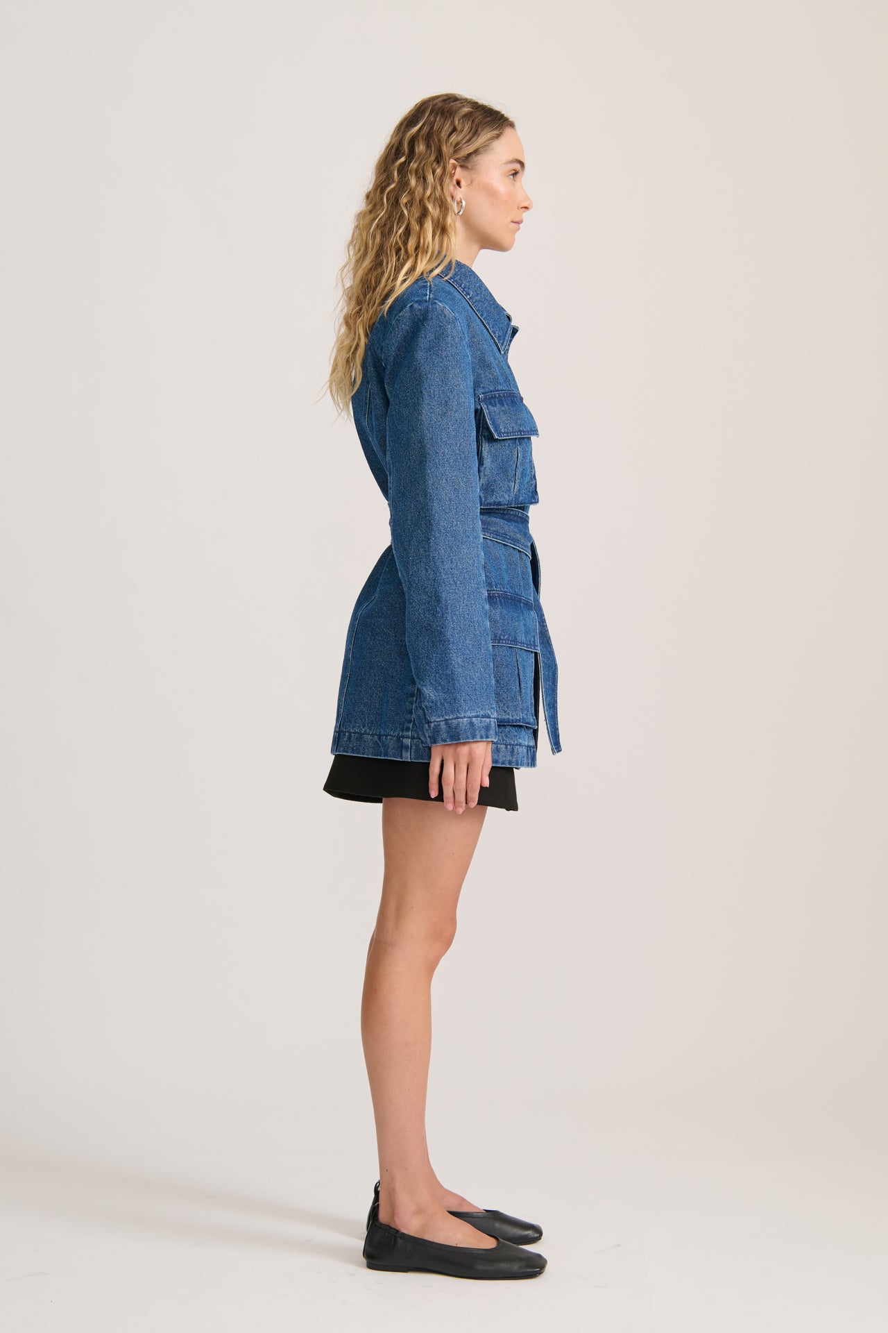 The Pocket Denim Jacket in Mid Blue reimagines utility with a refined edge. Cut from 100% cotton, the fitted silhouette is defined by functional flap pockets, a detachable belt to cinch the waist, and a concealed front tab fastened with press studs. Considered details — sleeve splits, back seam lines, and a center back vent — lend movement and modernity. Style it as a denim set with the Barrel Jean for a directional head-to-toe look, or pair with the Everypant for an understated, off-duty mood.