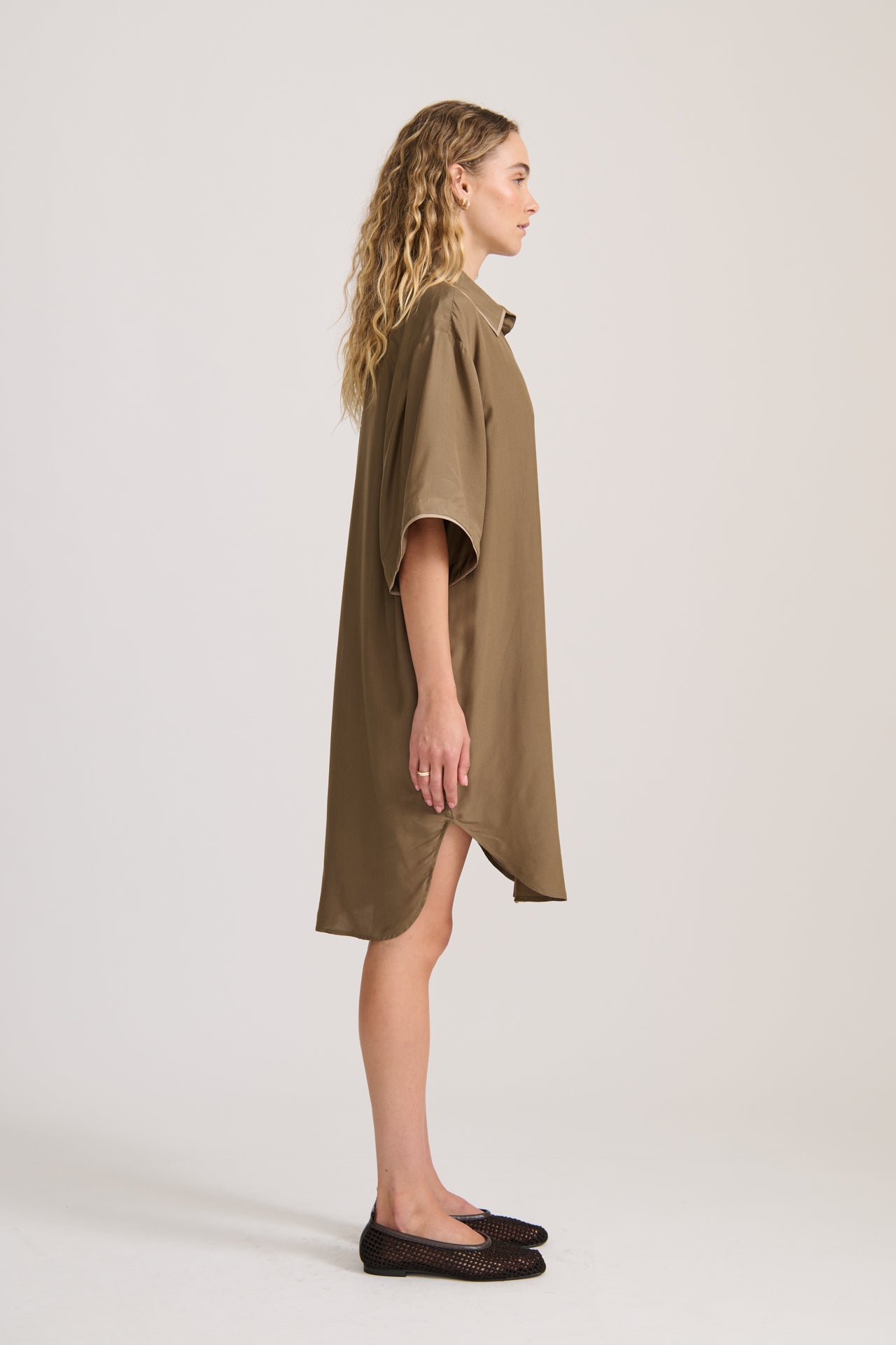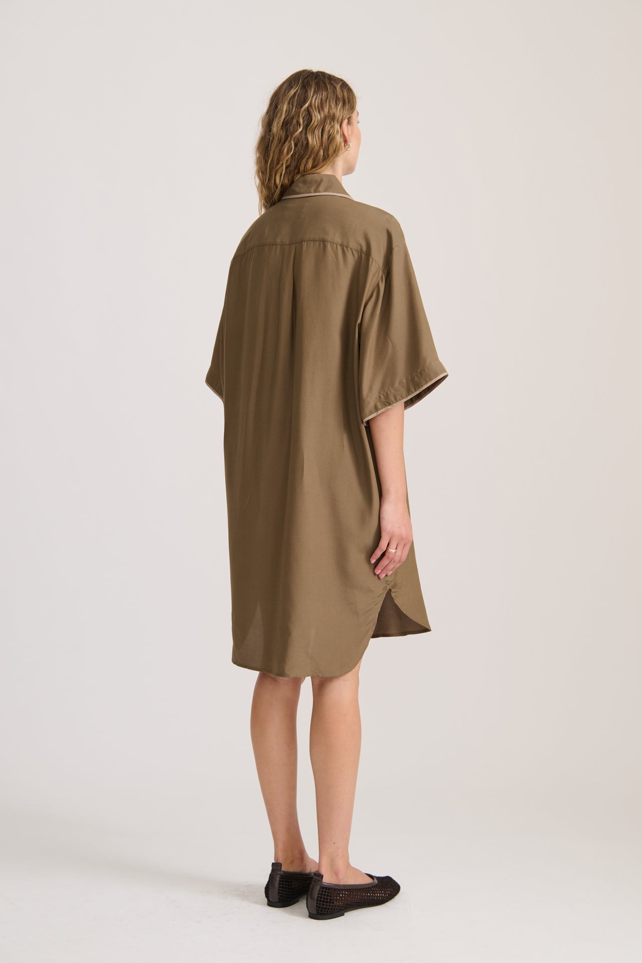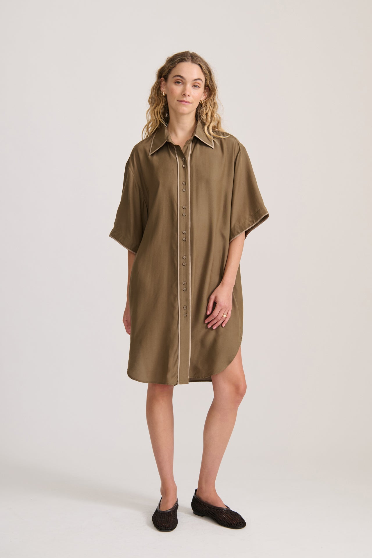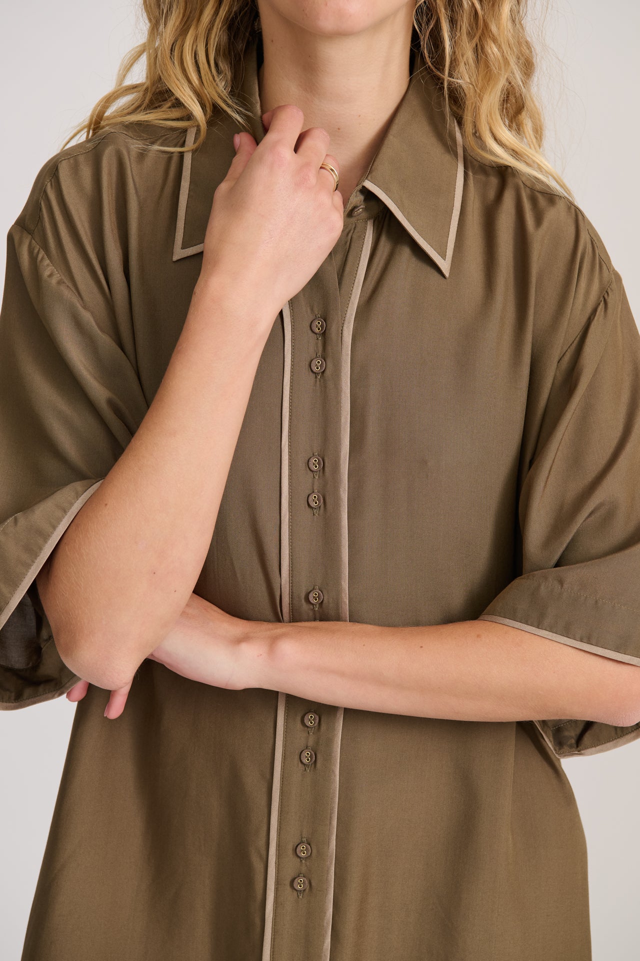 The Silk-Blend Shirt Dress in Wild Green is a statement in effortless elegance. Featuring an oversized fit, dropped shoulders, and contrast edging trims, it blends relaxed structure with refined detail. Designed with a curved hem, above-the-knee length, and concealed front tab, this lightweight silk-blend piece drapes beautifully—perfect for elevated everyday wear or layering.