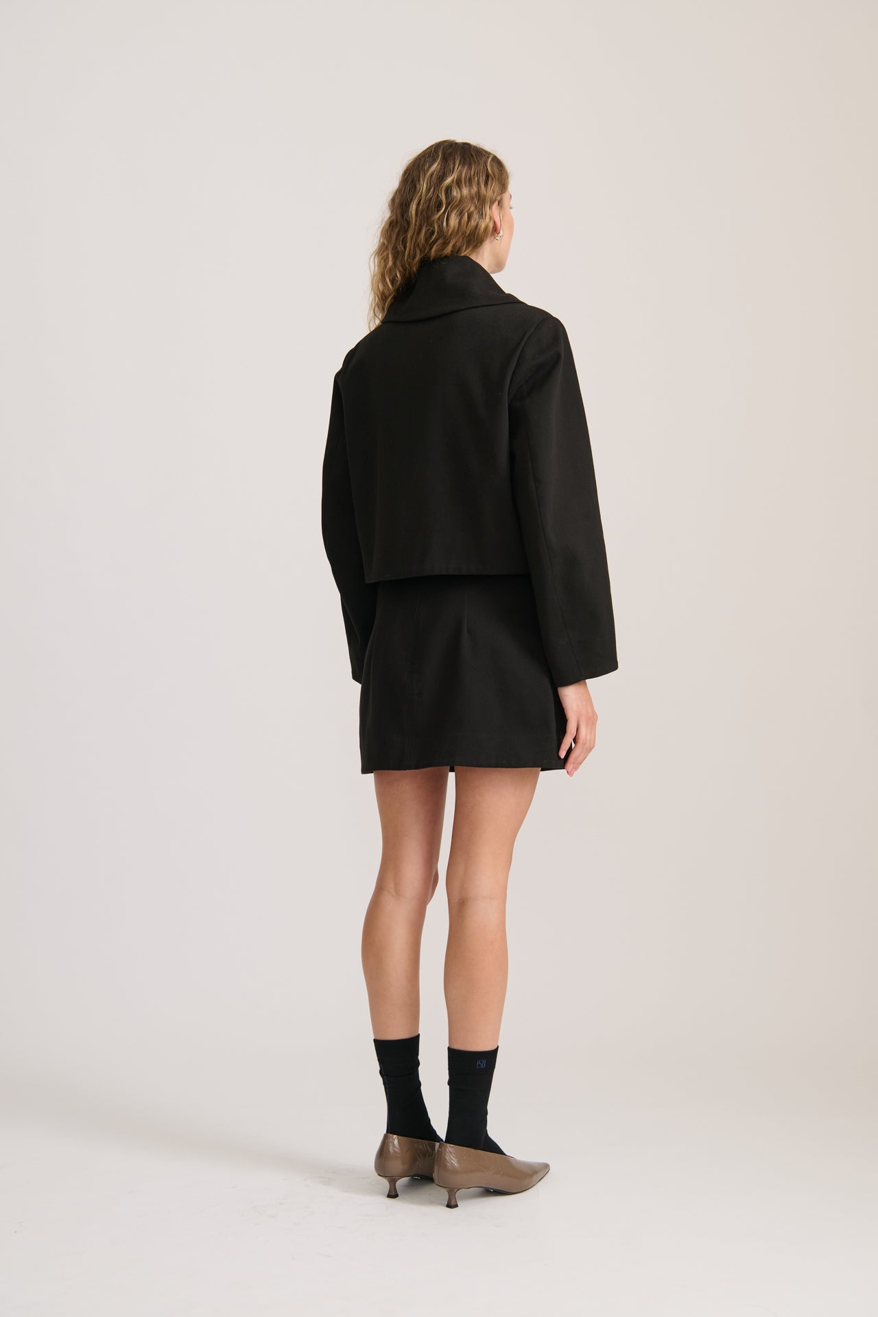 The Tailored Drill Mini Skirt in Black is a refined take on a wardrobe staple. Designed with a flattering high waist and an A-line silhouette, this skirt features a center-front stitch detail for subtle structure. Functional pockets add versatility, while the mini length and relaxed fit create a modern, effortless feel. Crafted from 100% cotton drill, it offers durability with a soft, comfortable finish—perfect for styling from day to night.