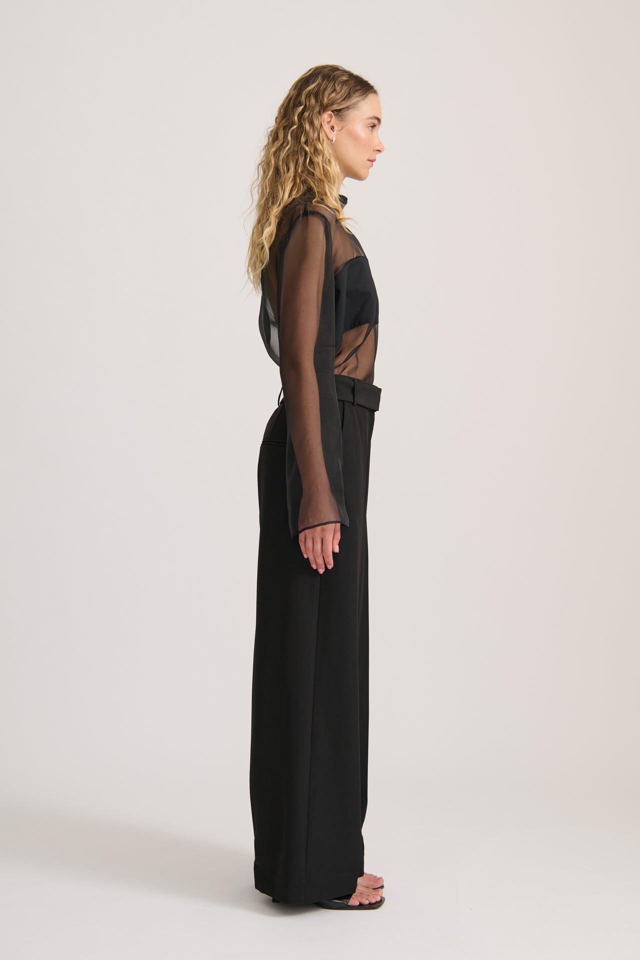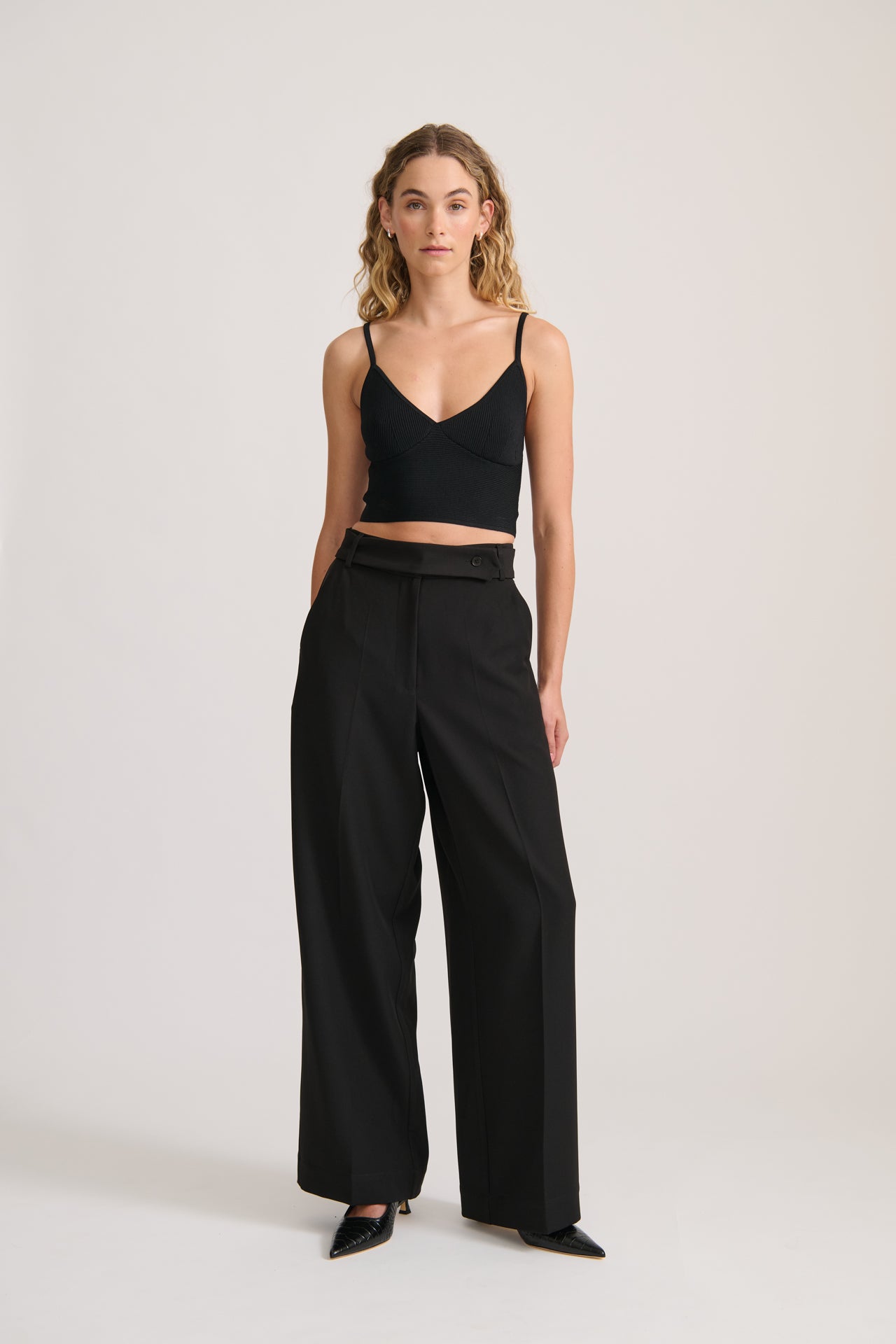 A timeless wardrobe staple, the Tailored Trouser in Black is designed for effortless sophistication. Featuring a high-waisted fit with a detachable belt for versatile styling, these full-length trousers are cut in a flattering straight-leg silhouette. Pleats at the front add structure, while functional side pockets and jet pockets offer practicality. Crafted from a premium polyester-spandex blend with 100% cotton pocketing for comfort and durability. Pair with the Sleeveless Wrap Top for an elevated day-to-night look.