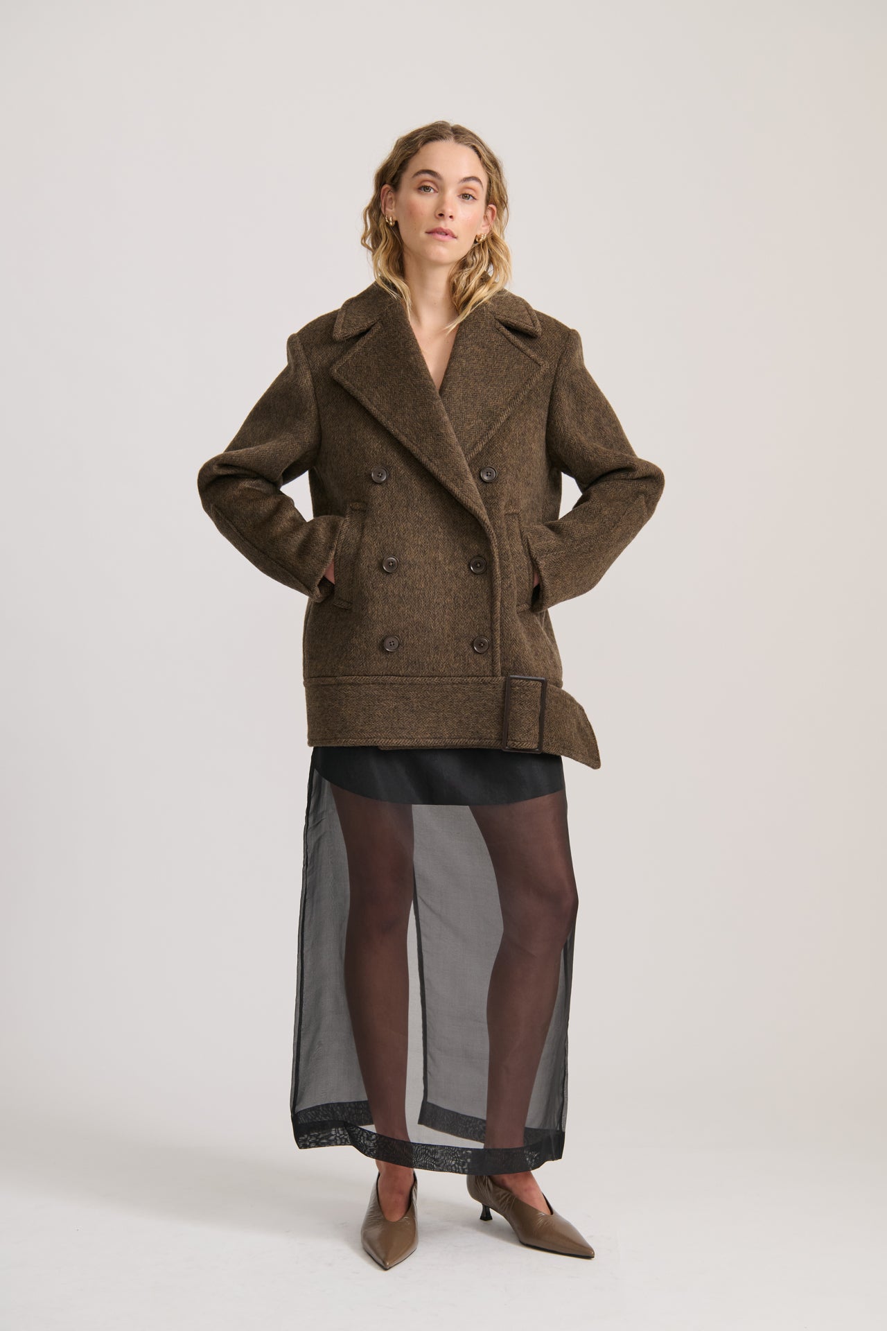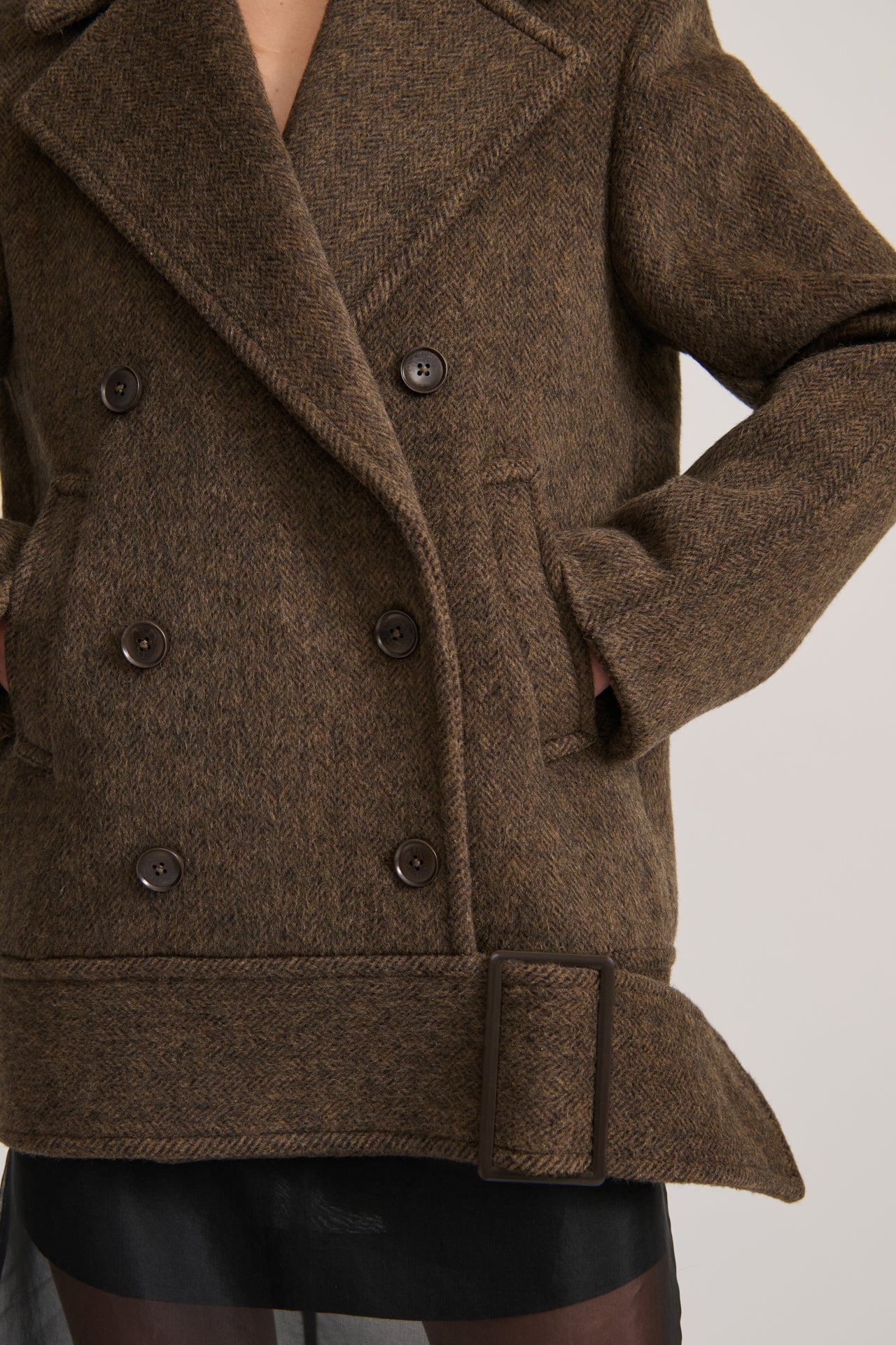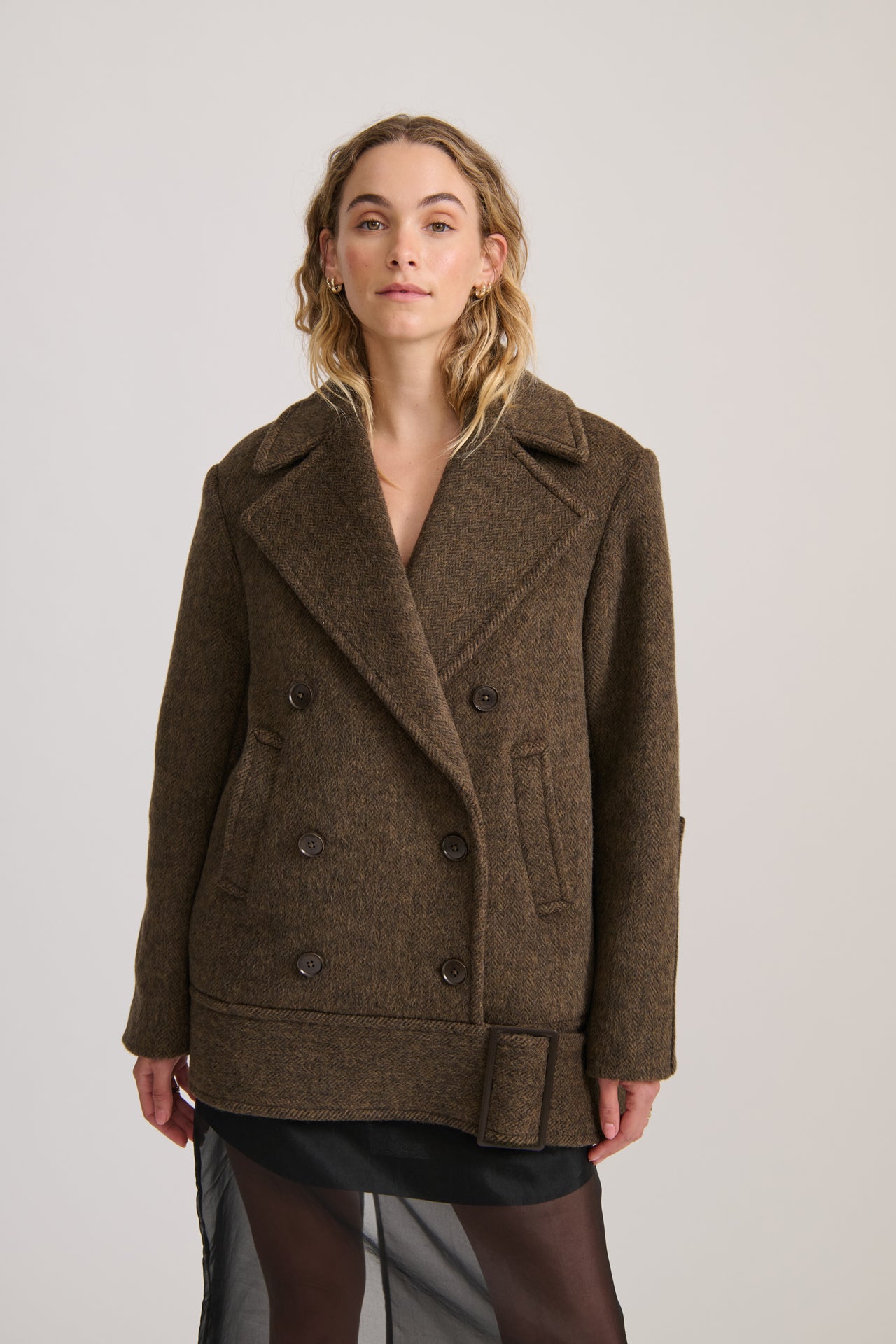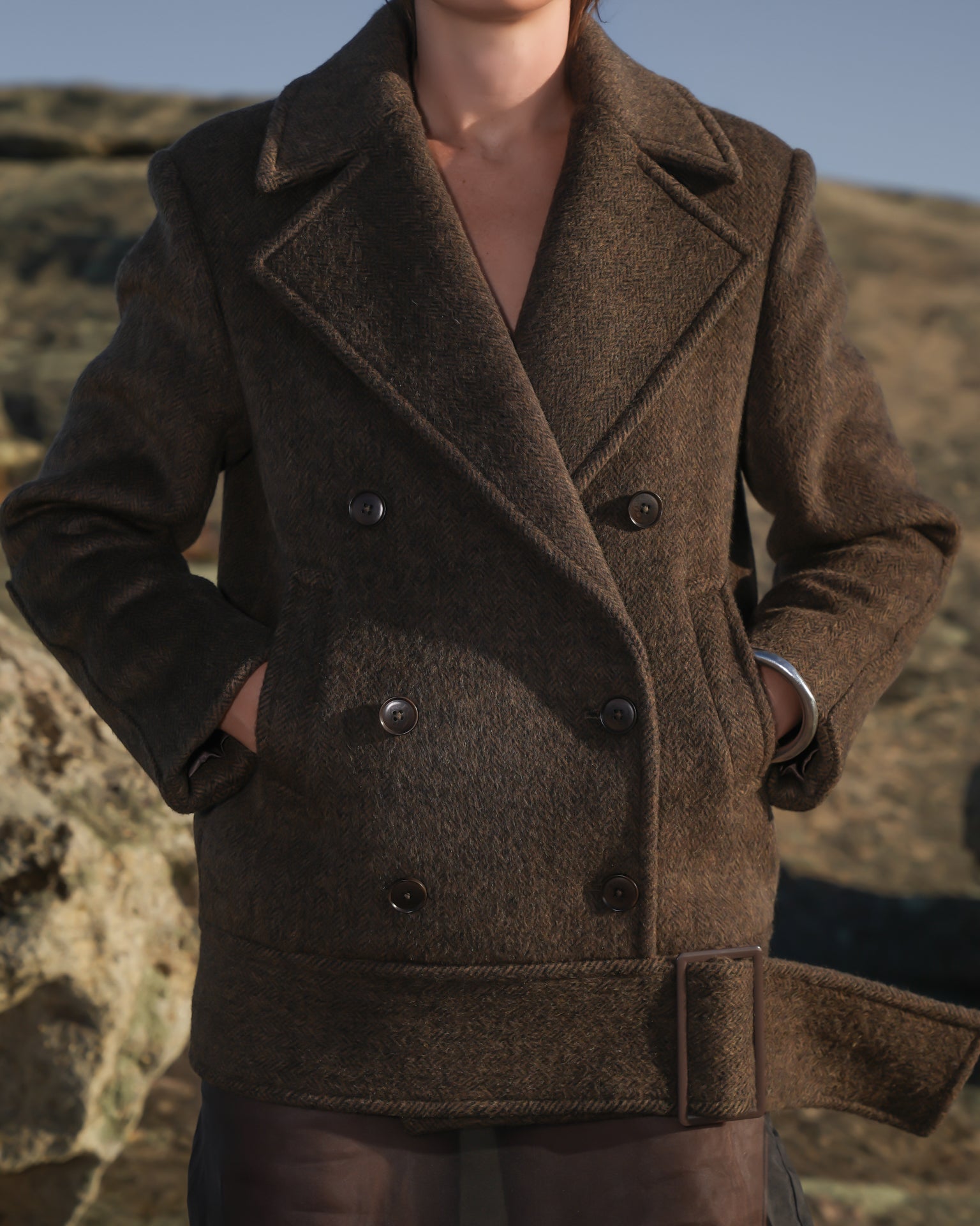 Crafted from a luxurious heavyweight wool blend, the Wool Jacket in Rich Cacao delivers structure and warmth with a refined edge. Featuring an oversized fit, visible front buttons, front pockets, and a unique buckle detail at the hem, this jacket is tailored for both function and form. Fully lined for comfort, it’s the ideal layer for cool-weather styling with a timeless, elevated look.
