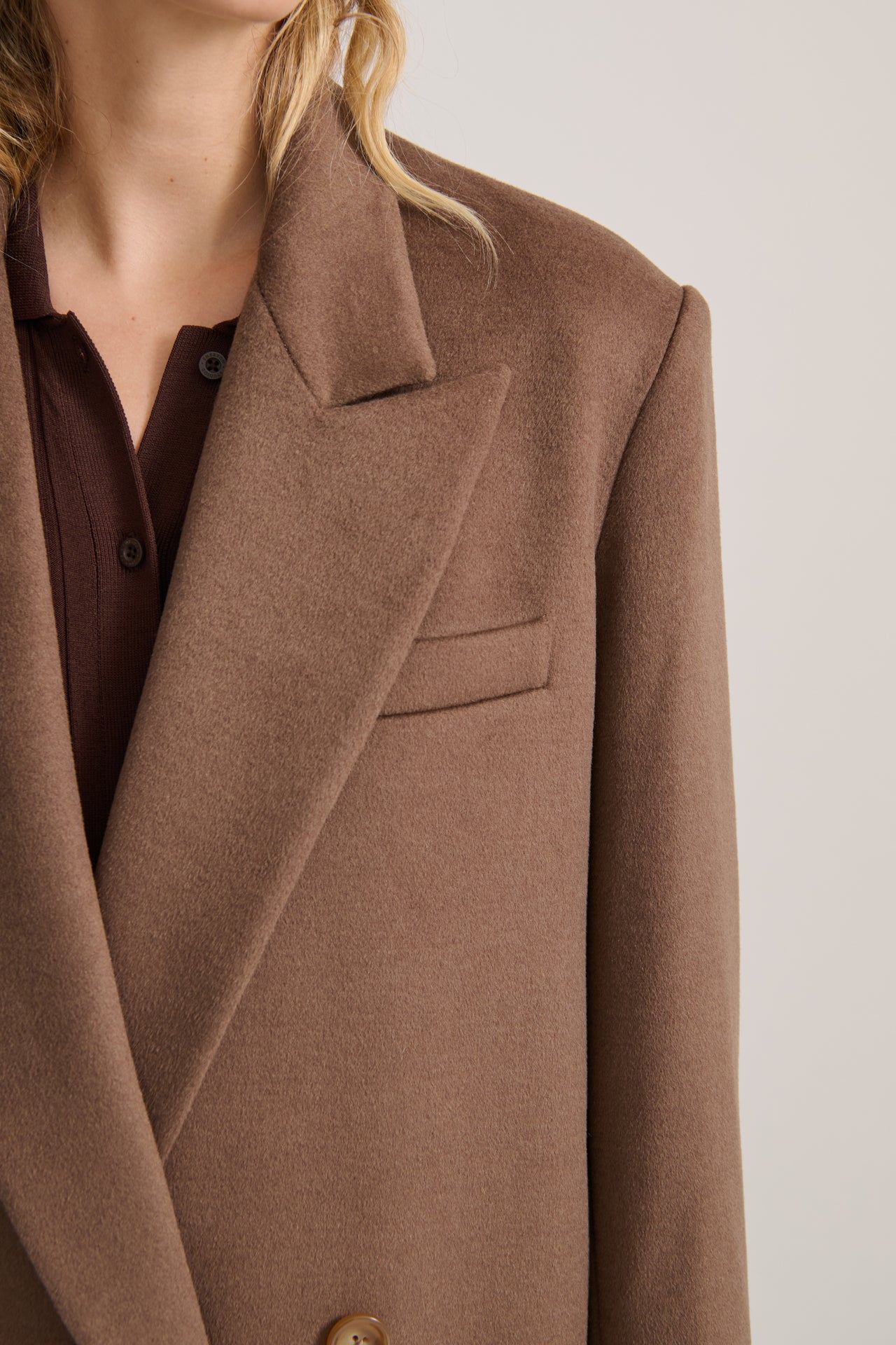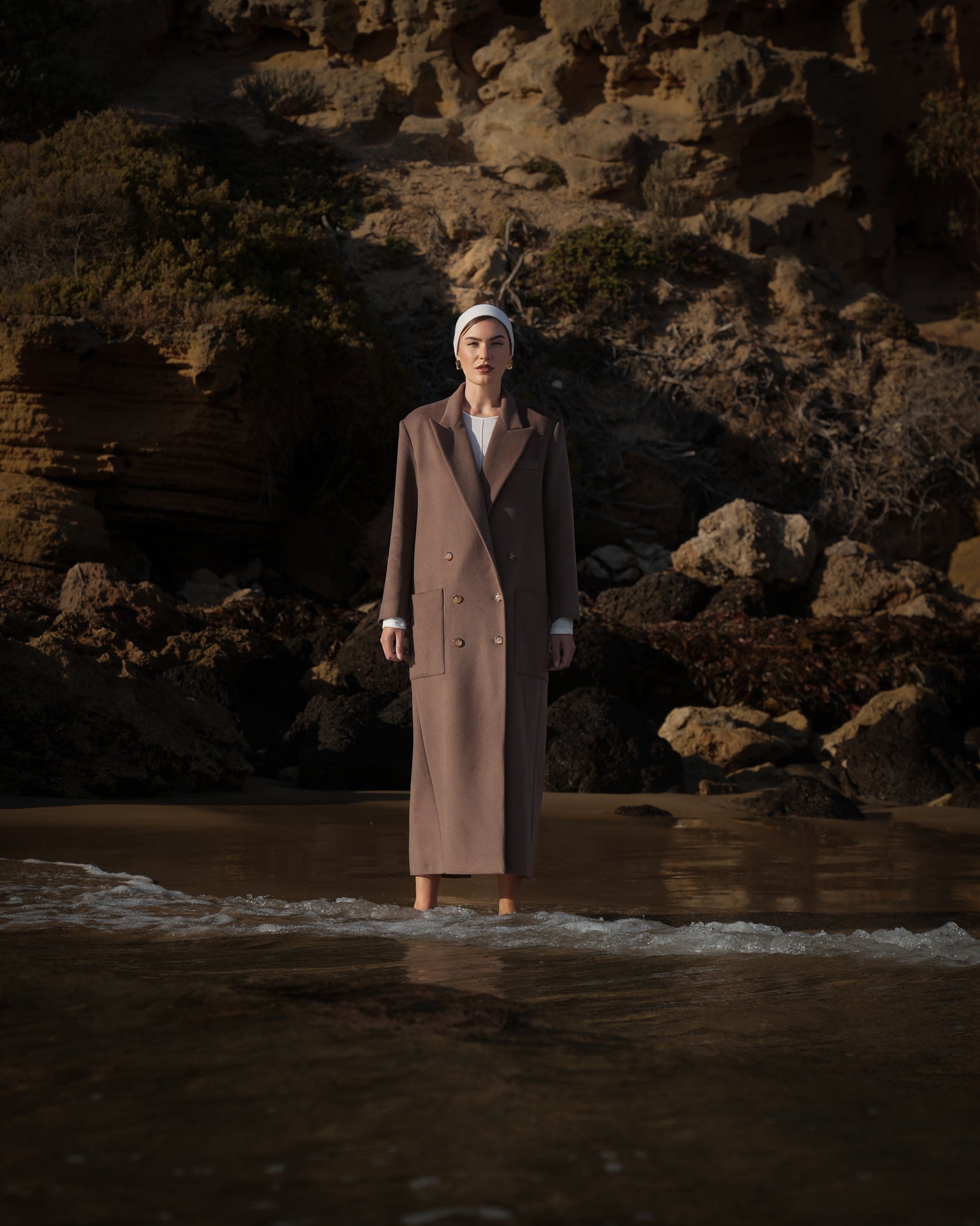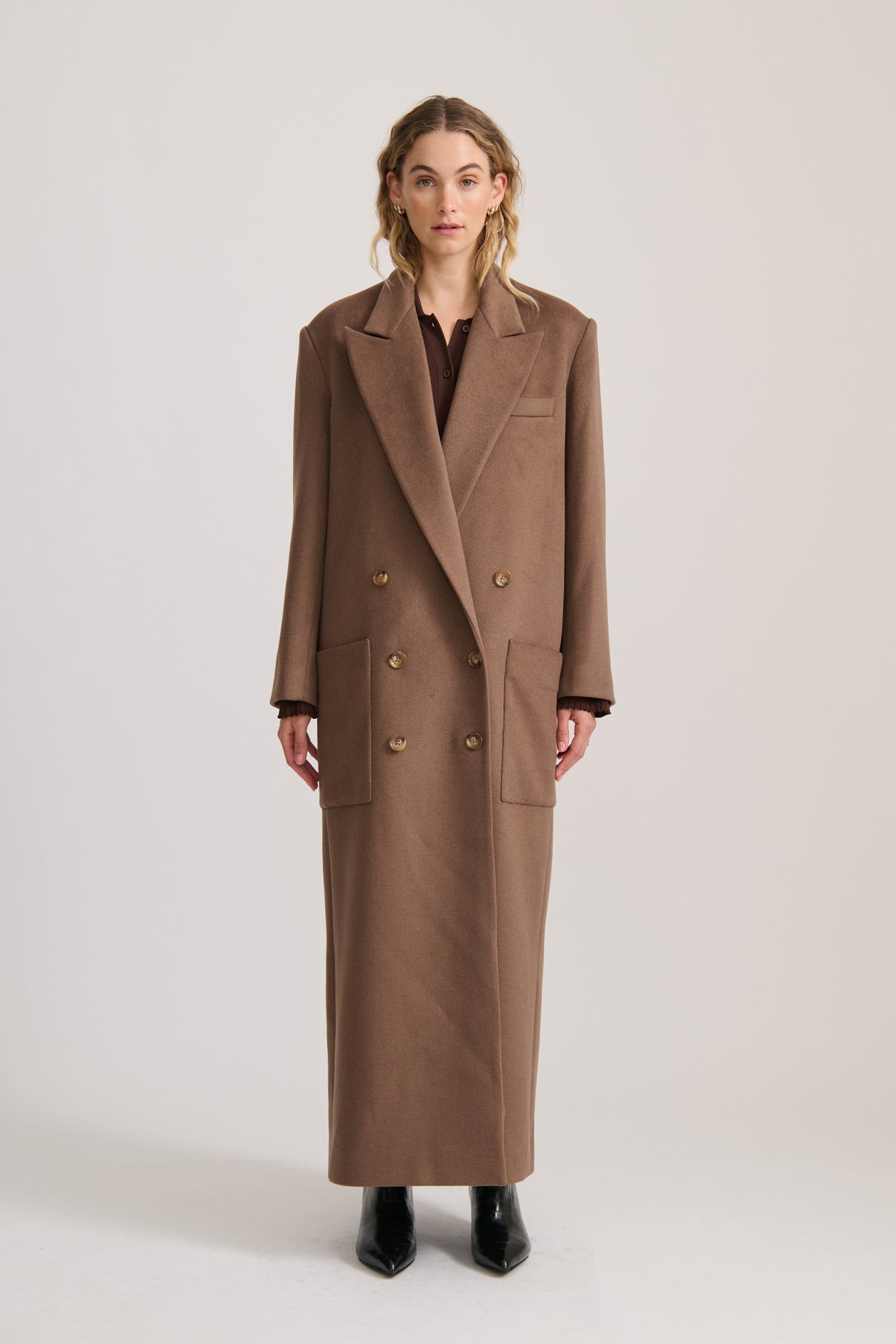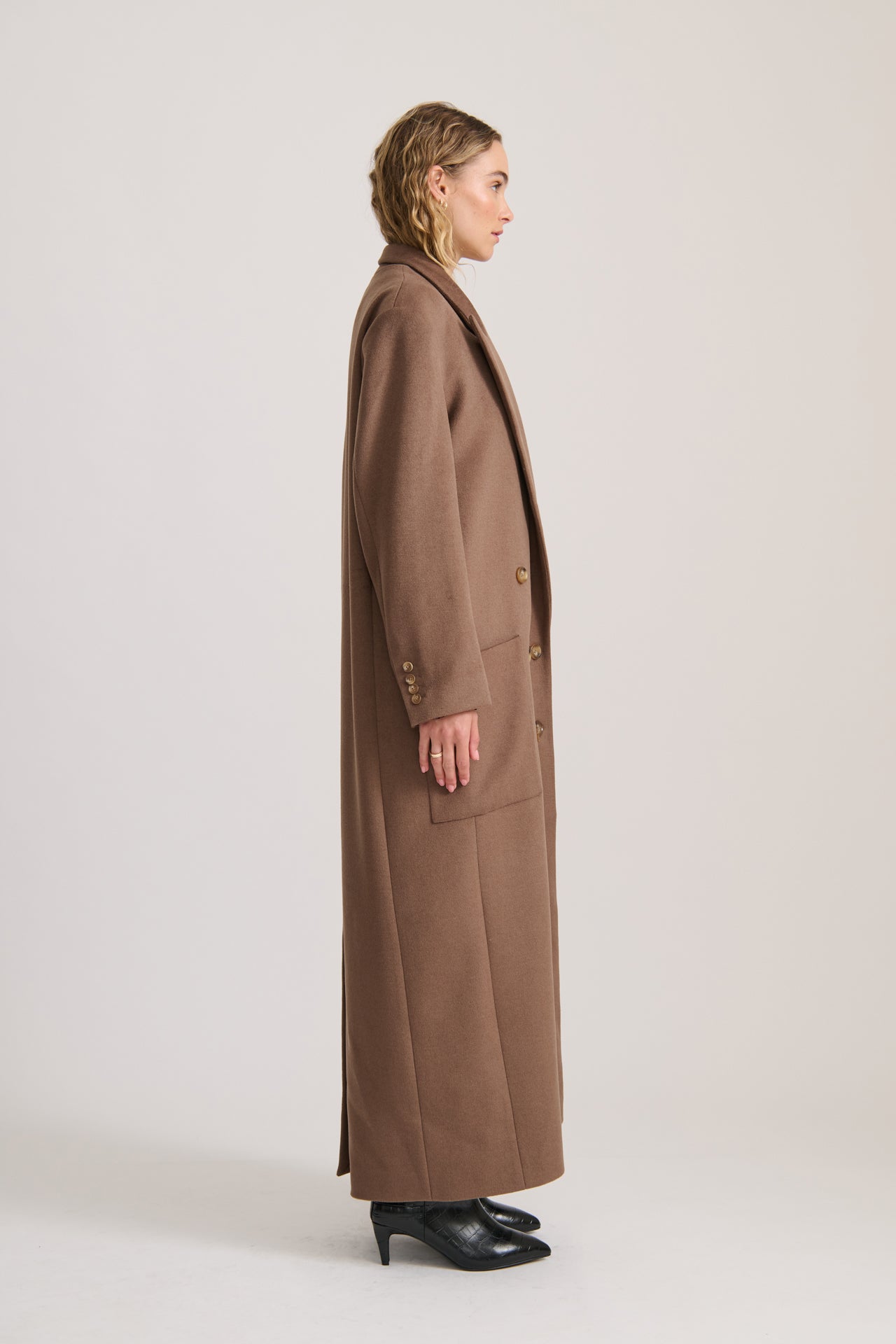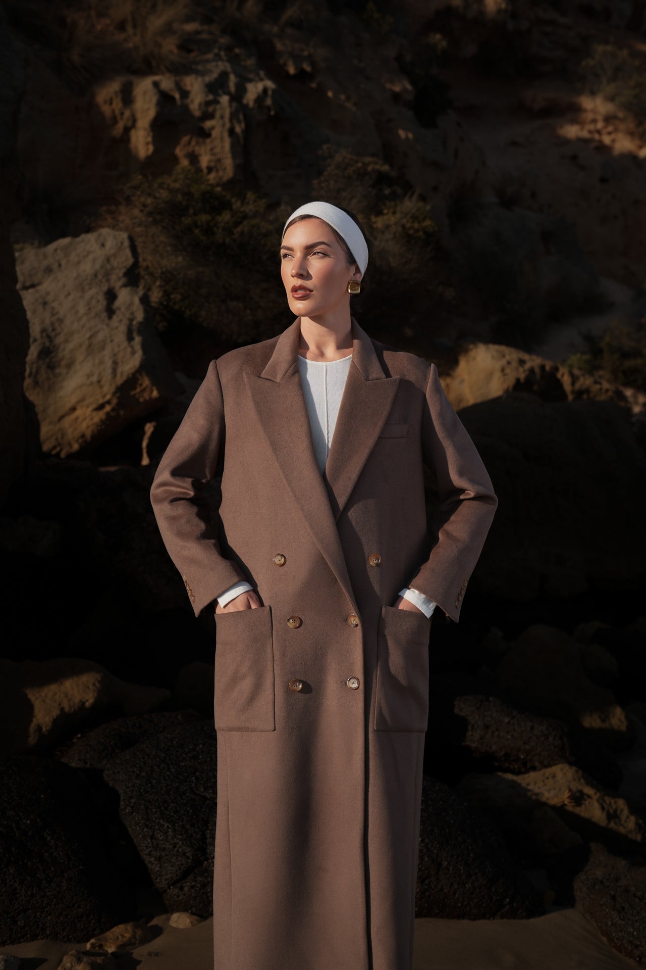 The Wool Longline Coat in Rich Cacao offers a refined approach to cold-weather dressing. Designed in a luxurious wool blend, this oversized, maxi-length silhouette features a double row of front buttons, tailored sleeve detailing, and practical front pockets. A center back split ensures ease of movement, while the deep cacao hue adds warmth and depth to your winter wardrobe. Minimalist, versatile, and timeless.