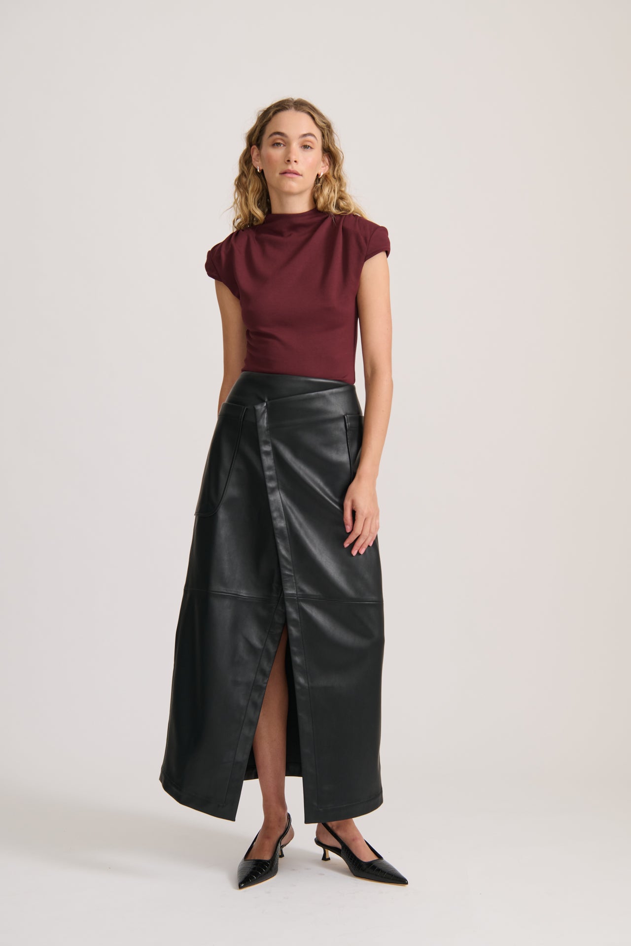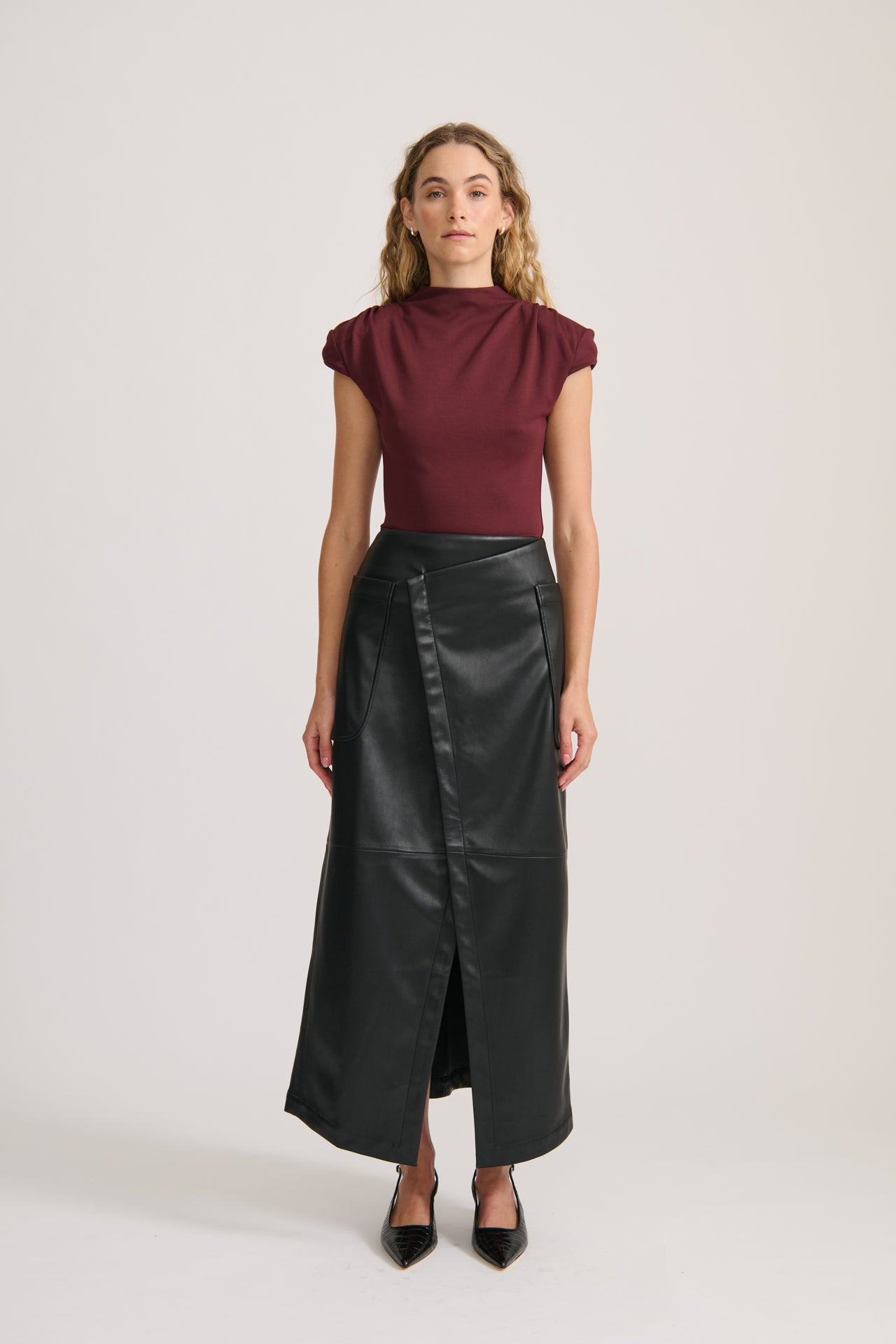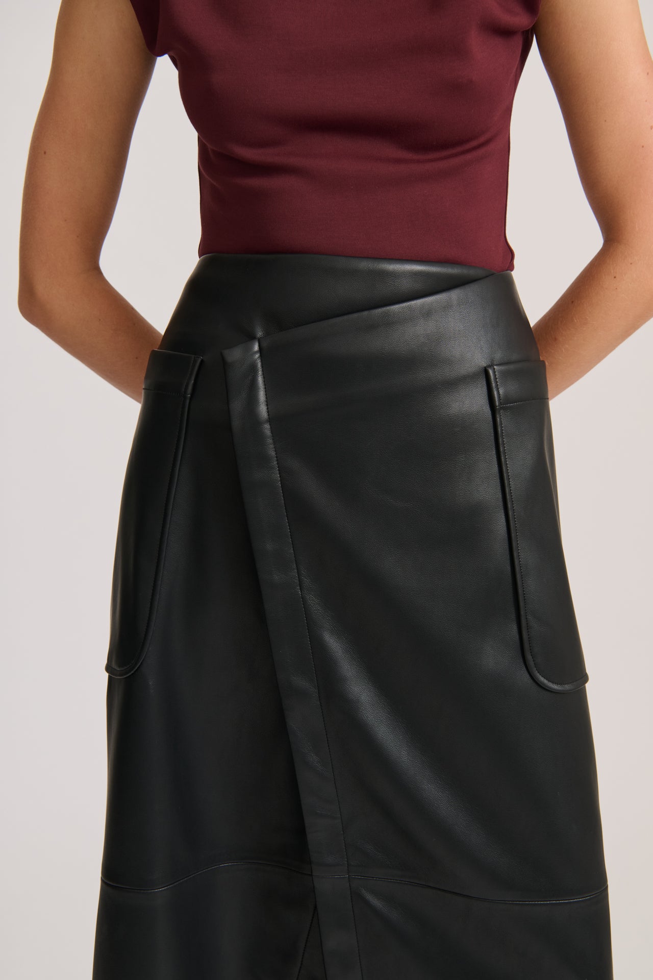 Designed for modern sophistication, the Wrap Vegan Leather Skirt in Black is the ultimate statement piece. With a mid-rise fit, wrap silhouette, and midi length, it balances elegance with an edge. Patch pockets add functionality, while horizontal design line seams enhance its structured appeal.