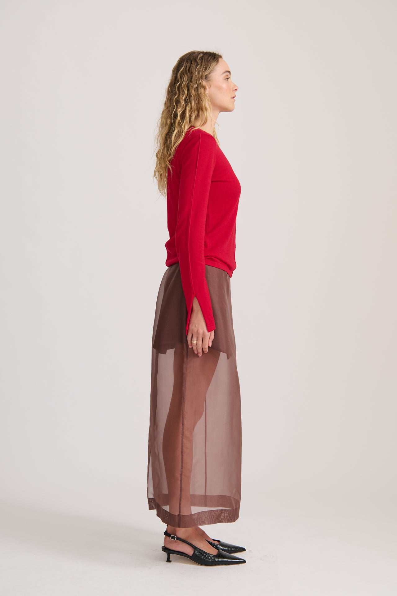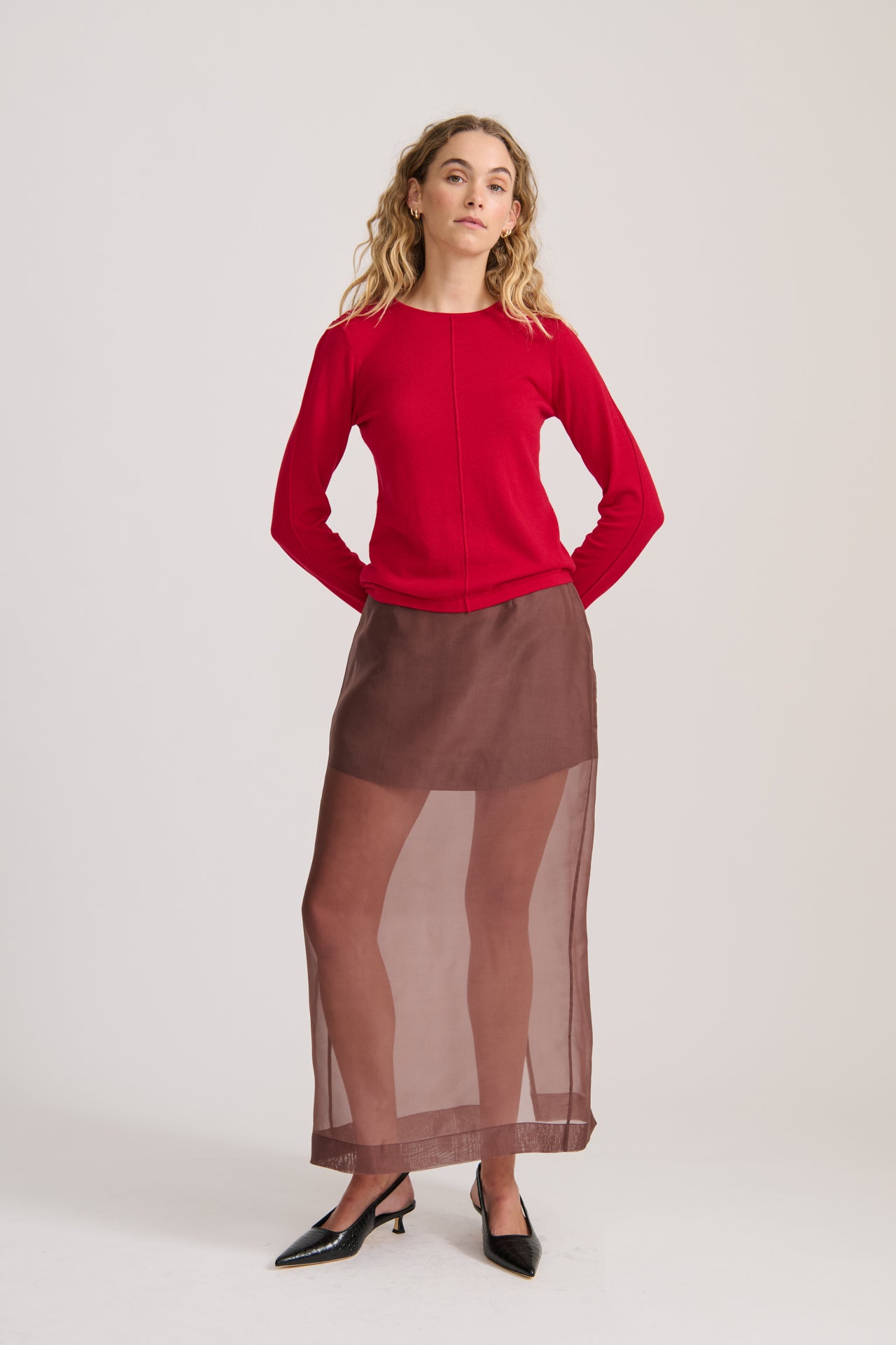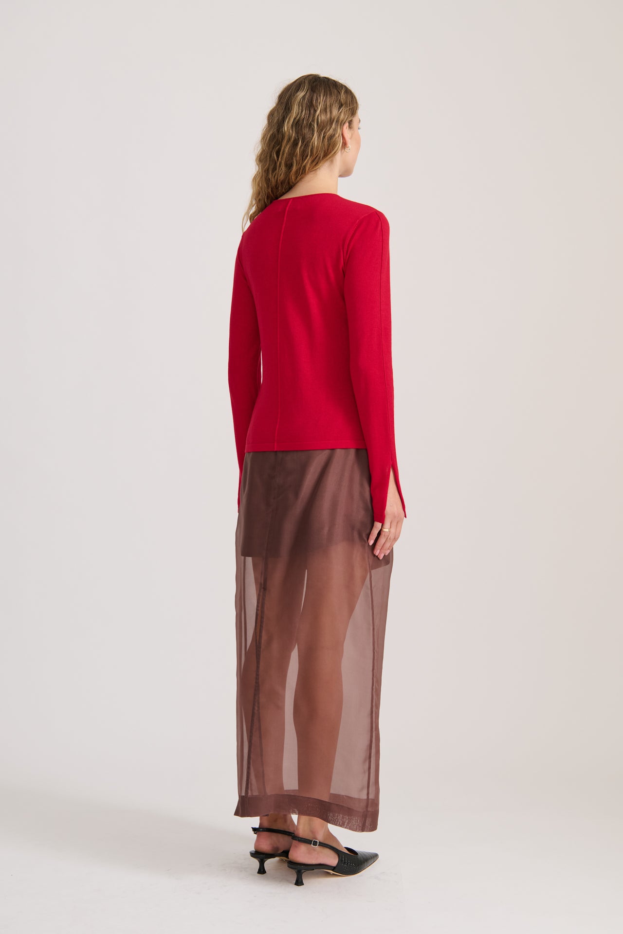 The Fine Knit Panelled Top in Crimson is a refined staple with elevated detail. Designed in a fitted silhouette, it features delicate tubing knit accents along the centre front, side seams, and back. Split sleeves bring a subtle edge, while the standard neckline keeps it versatile. Crafted from a soft lyocell-cotton blend, this top offers lightweight comfort and effortless sophistication for everyday wear. Style with the Everyday Pant for a low key, effortless look.