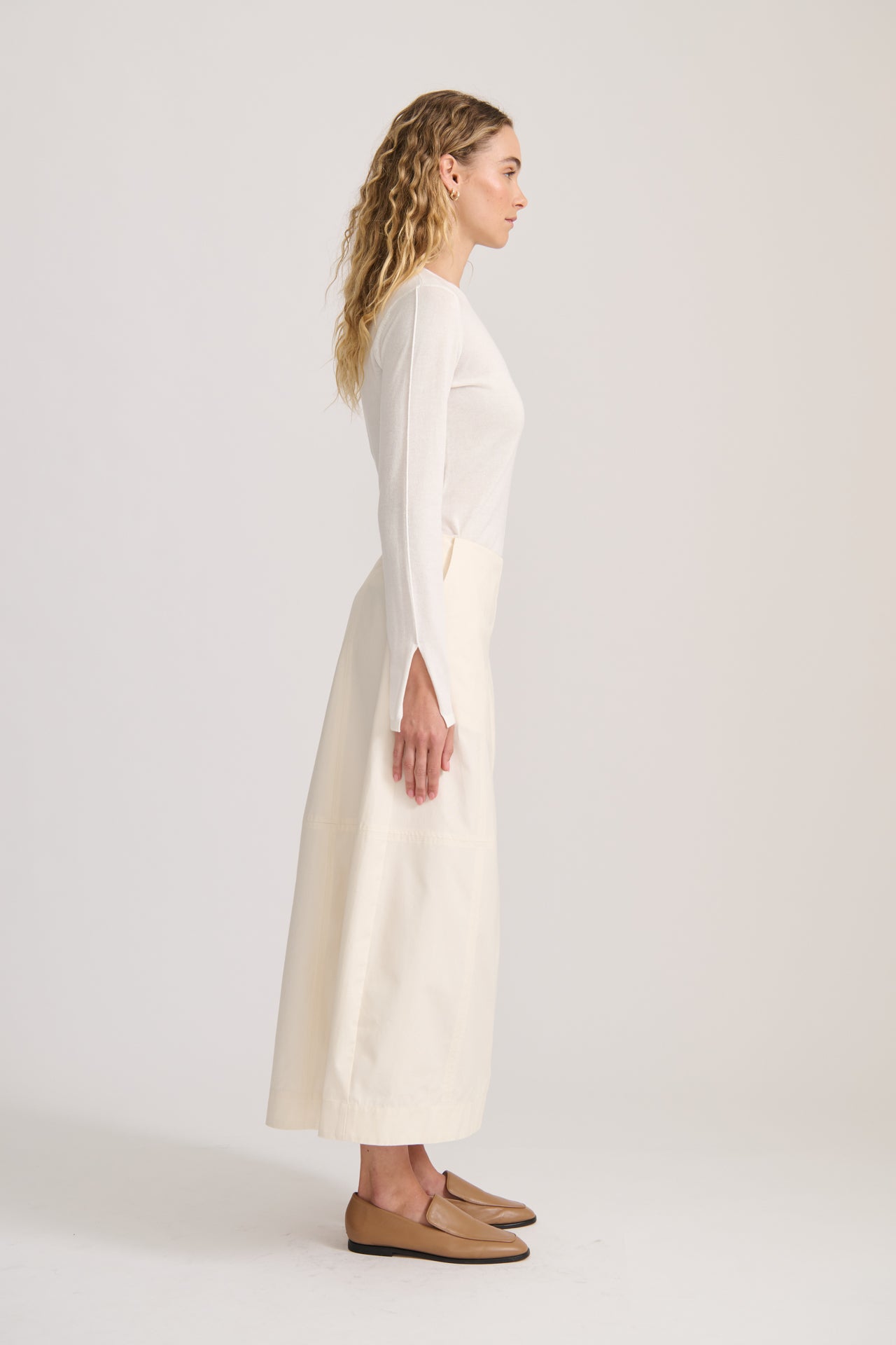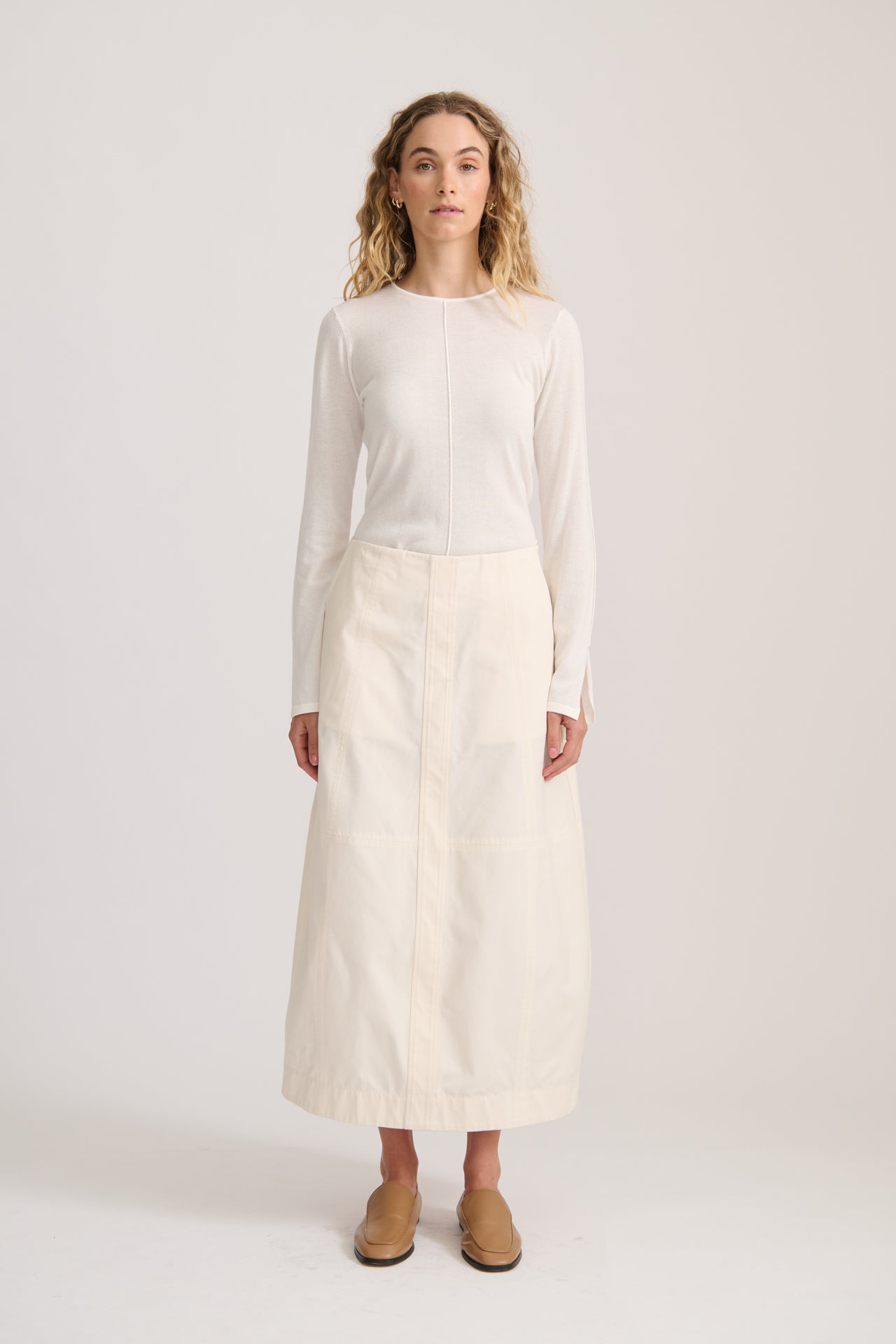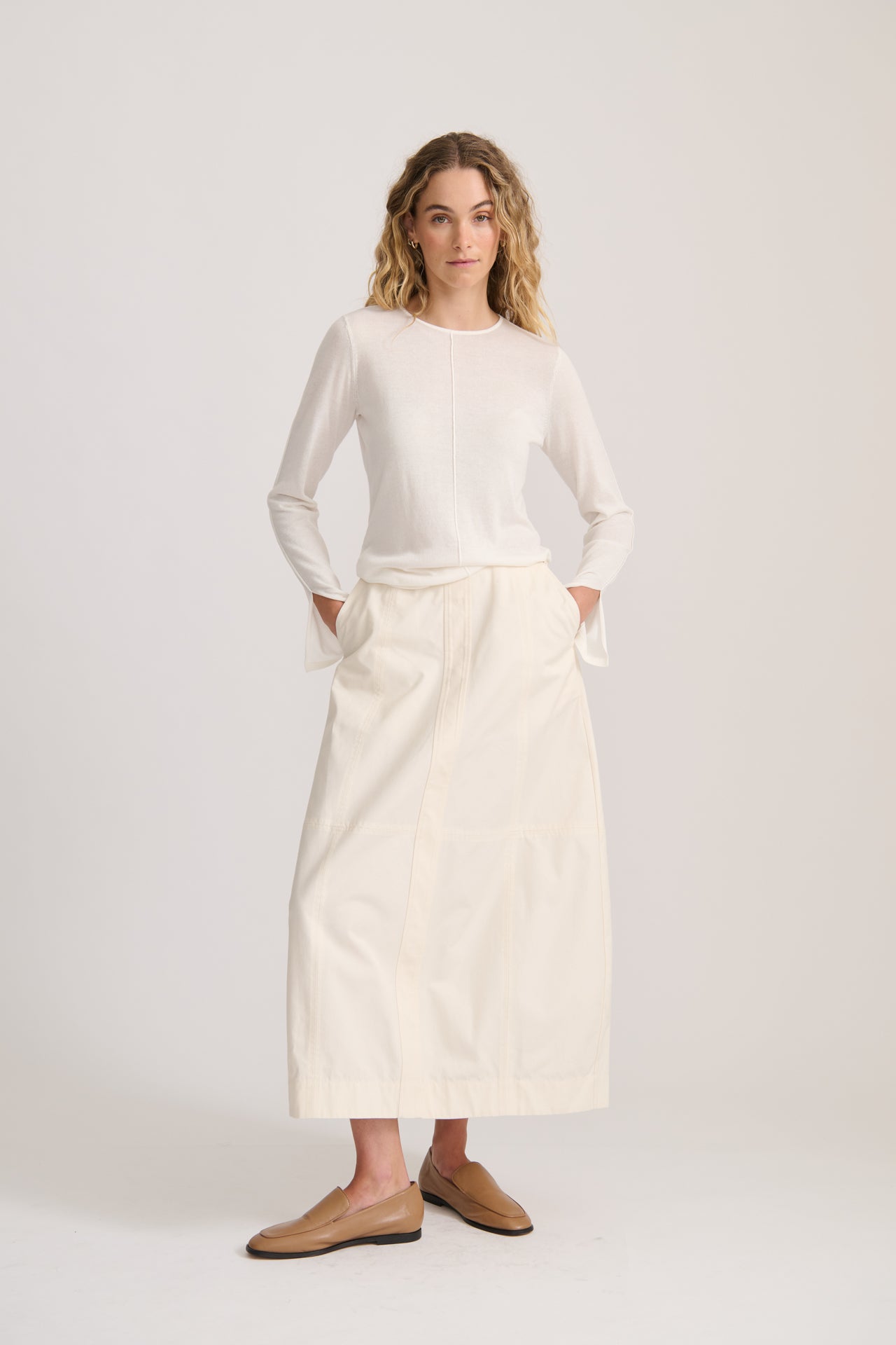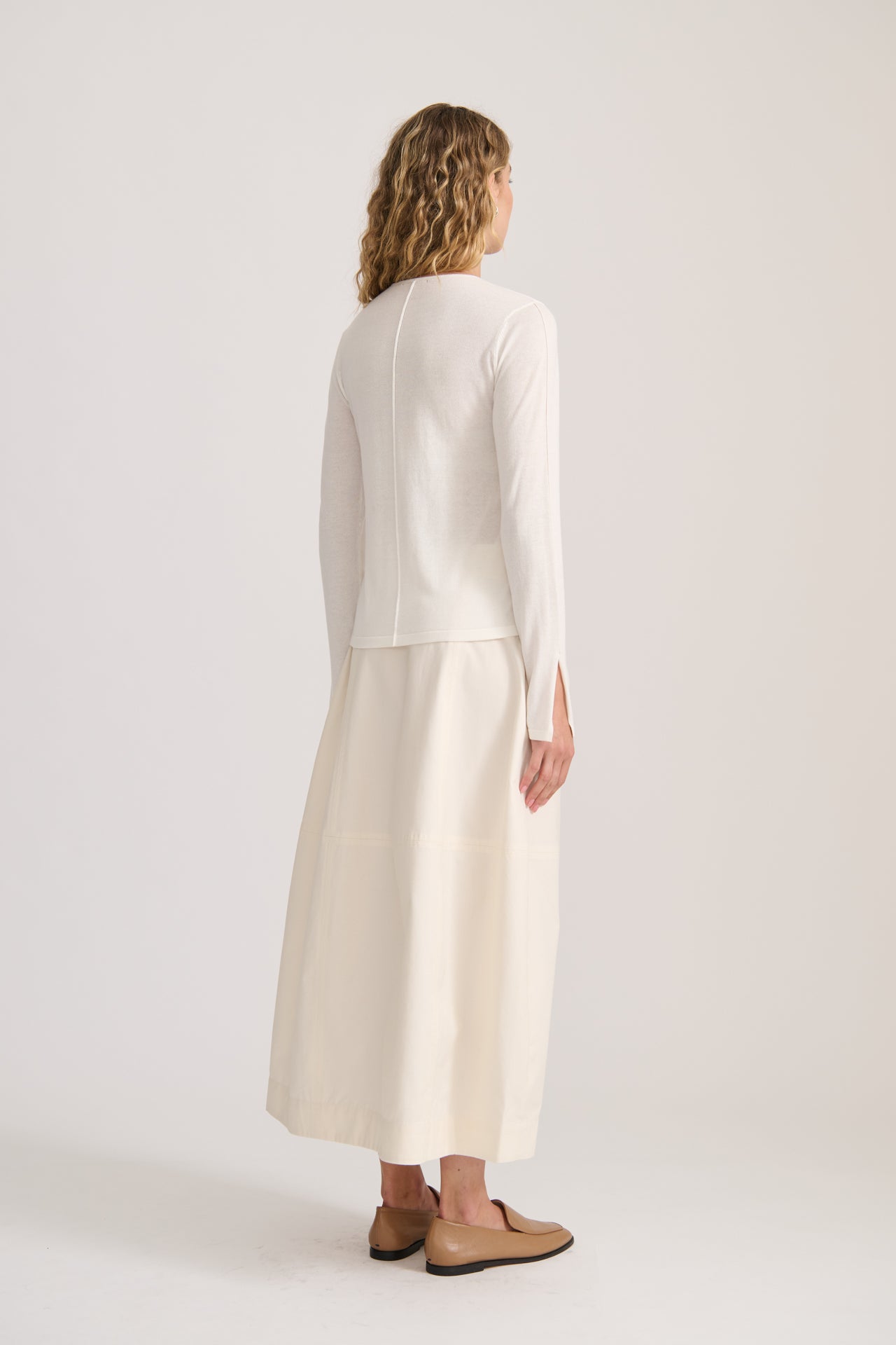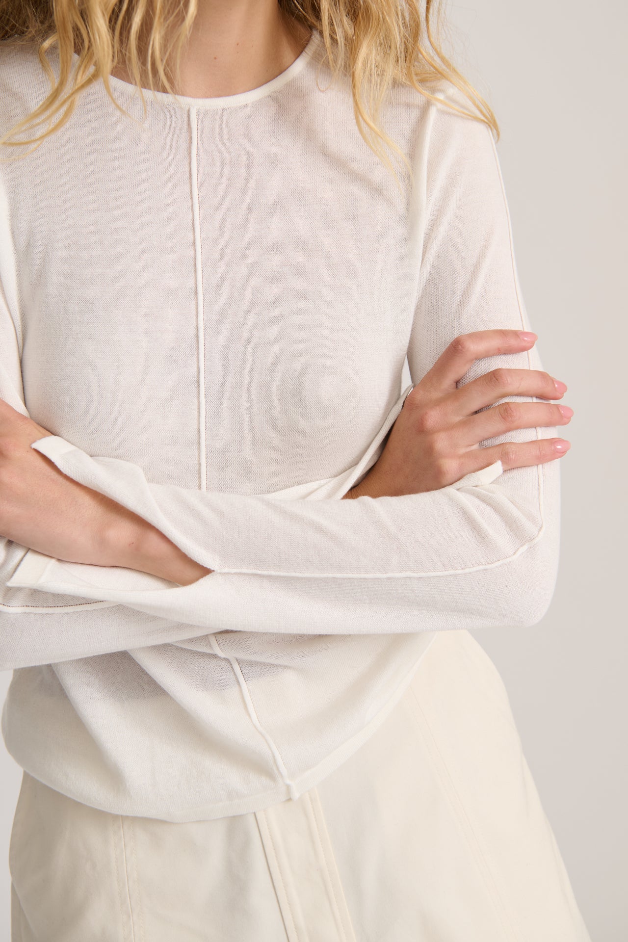 The Fine Knit Panelled Top in Ivory is a timeless wardrobe essential with modern detailing. Featuring a fitted silhouette, it’s accented with delicate tubing knit details along the center front, side seams, and back. Sleeve splits add a contemporary touch, while the standard neckline keeps it versatile. Crafted from a soft lyocell-cotton blend, this lightweight top delivers comfort and sophistication for everyday wear.