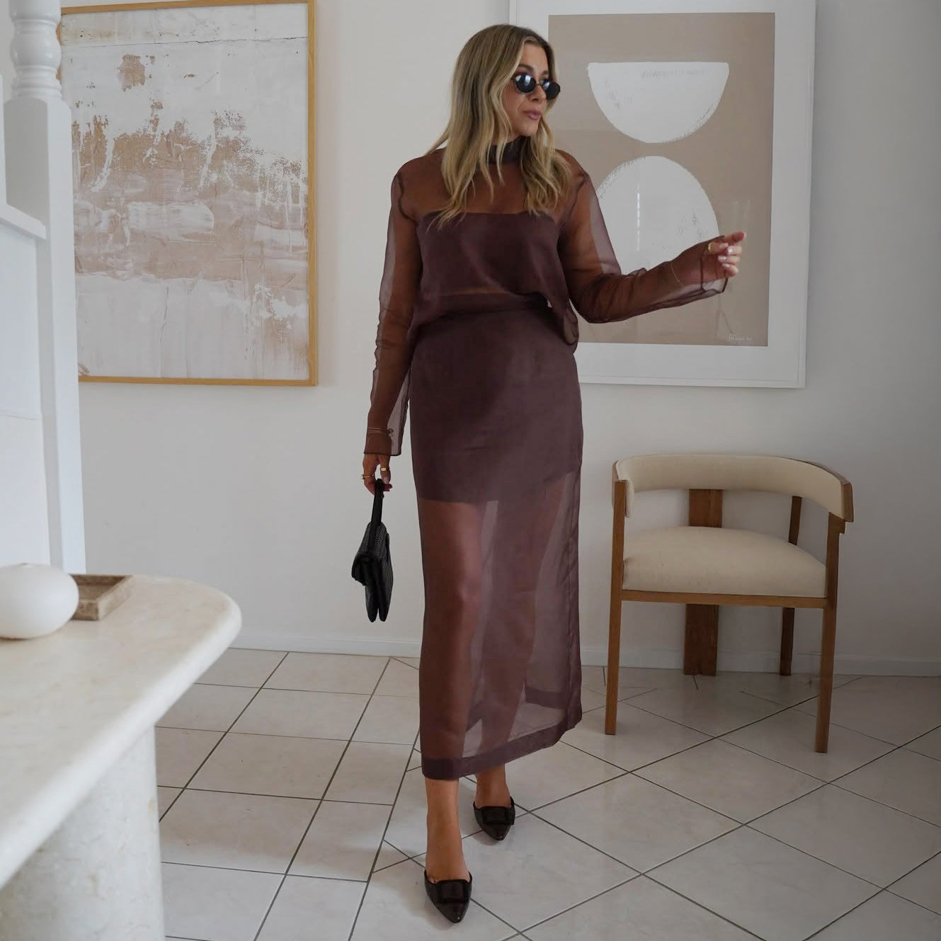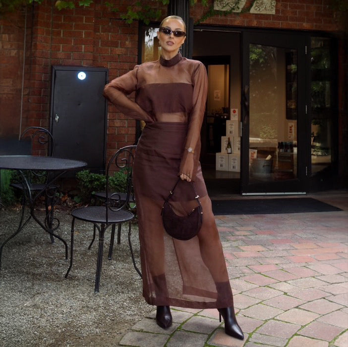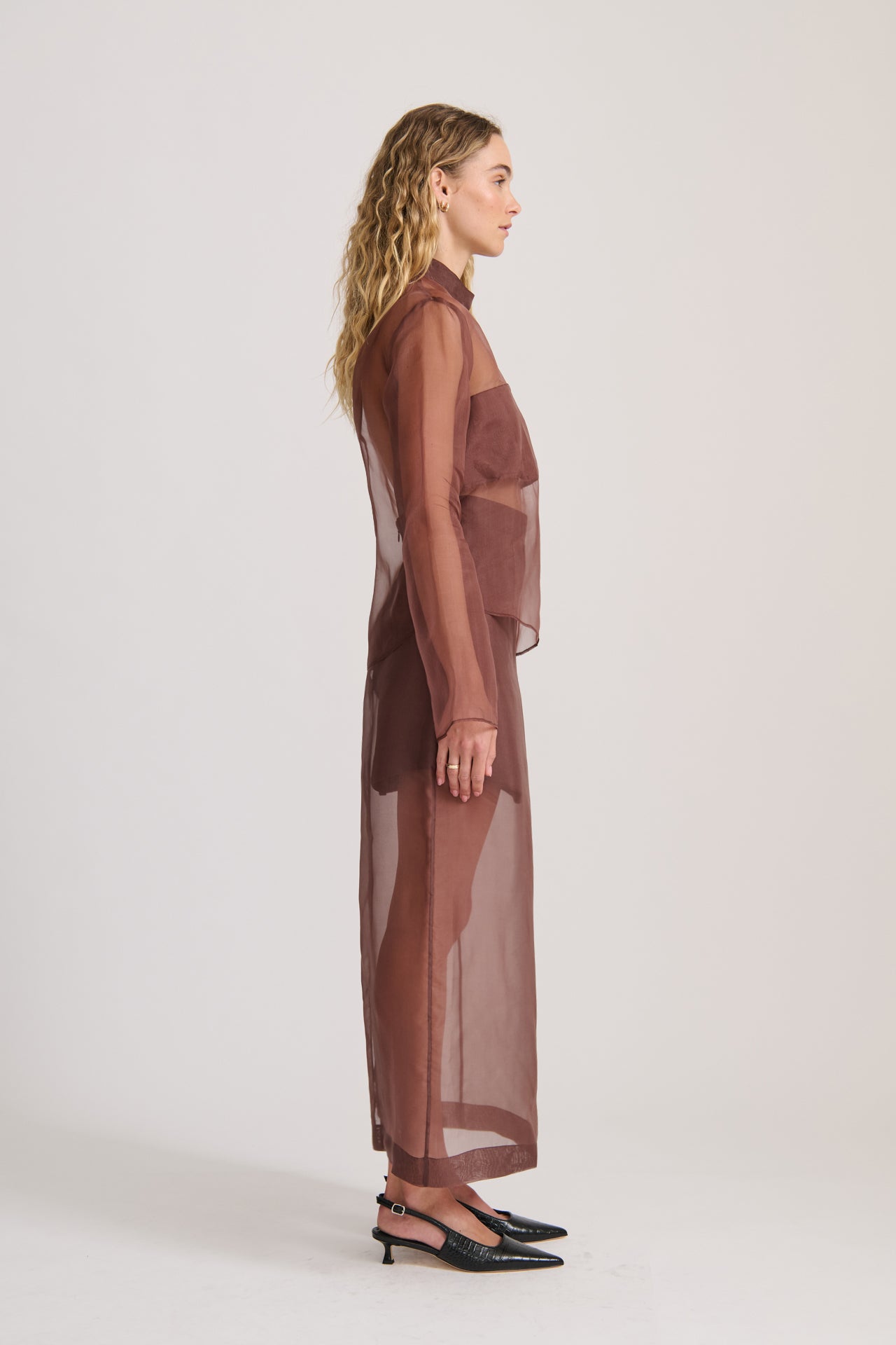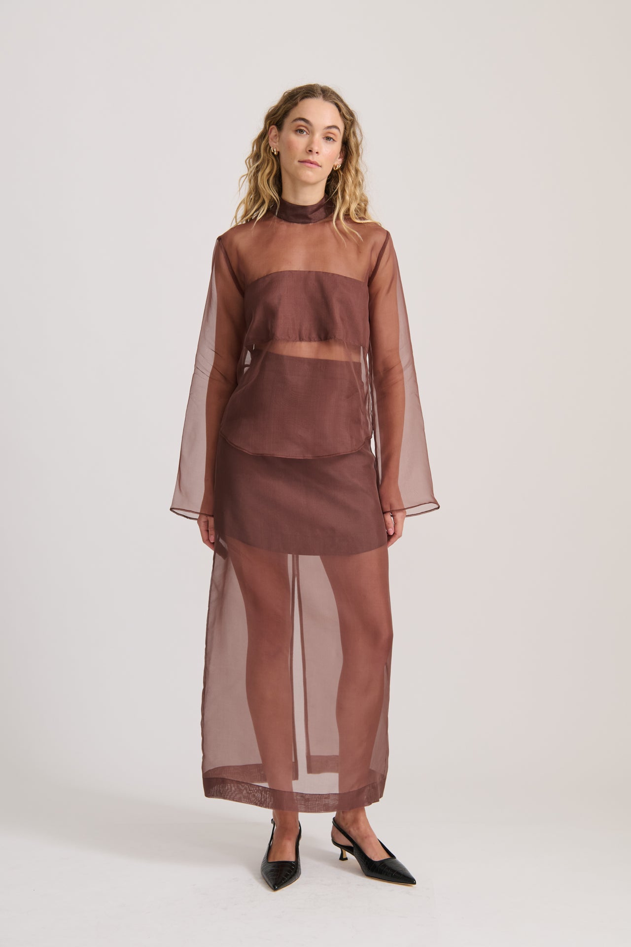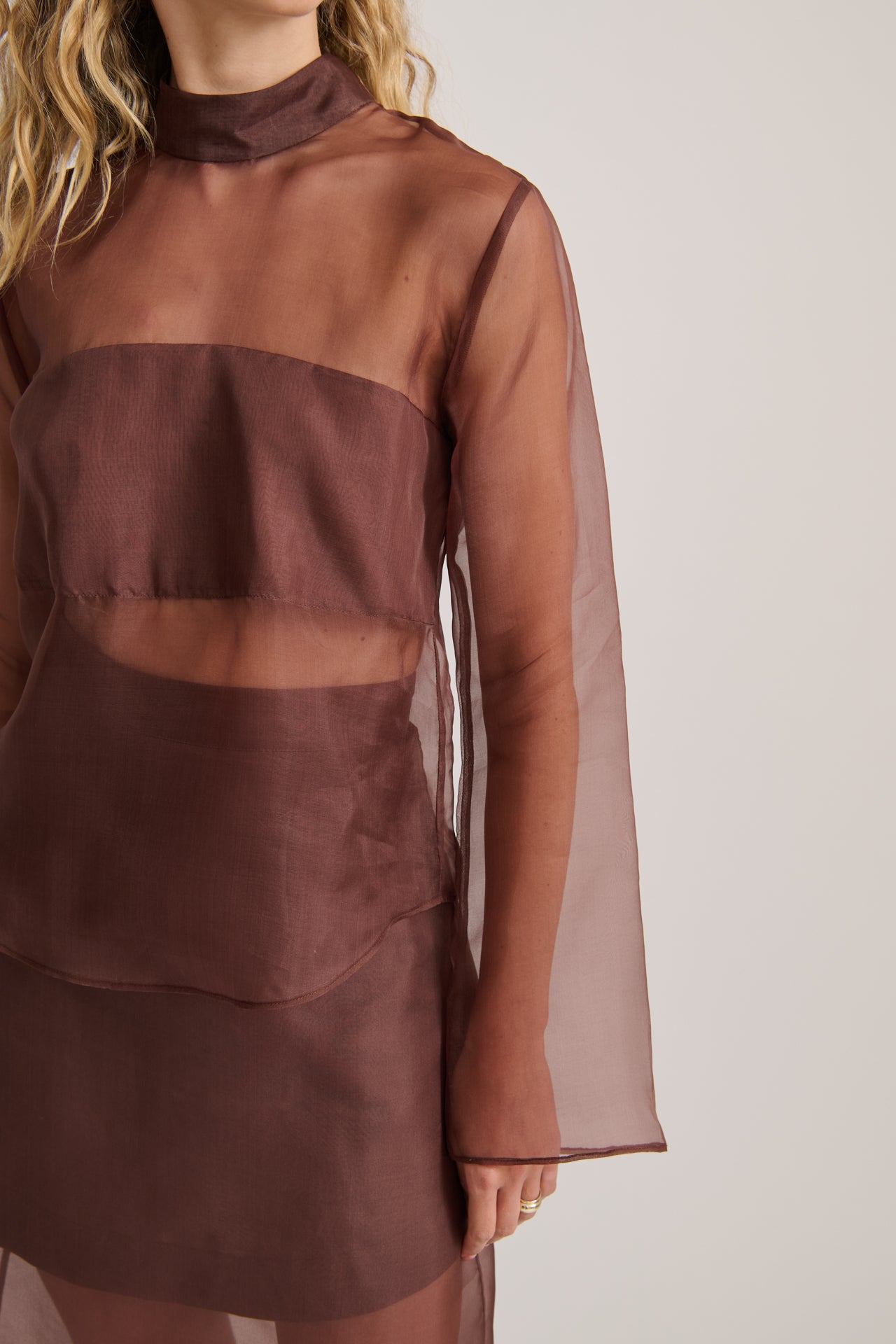 SHEER ORGANZA LONG SLEEVE TOP RICH CACAO