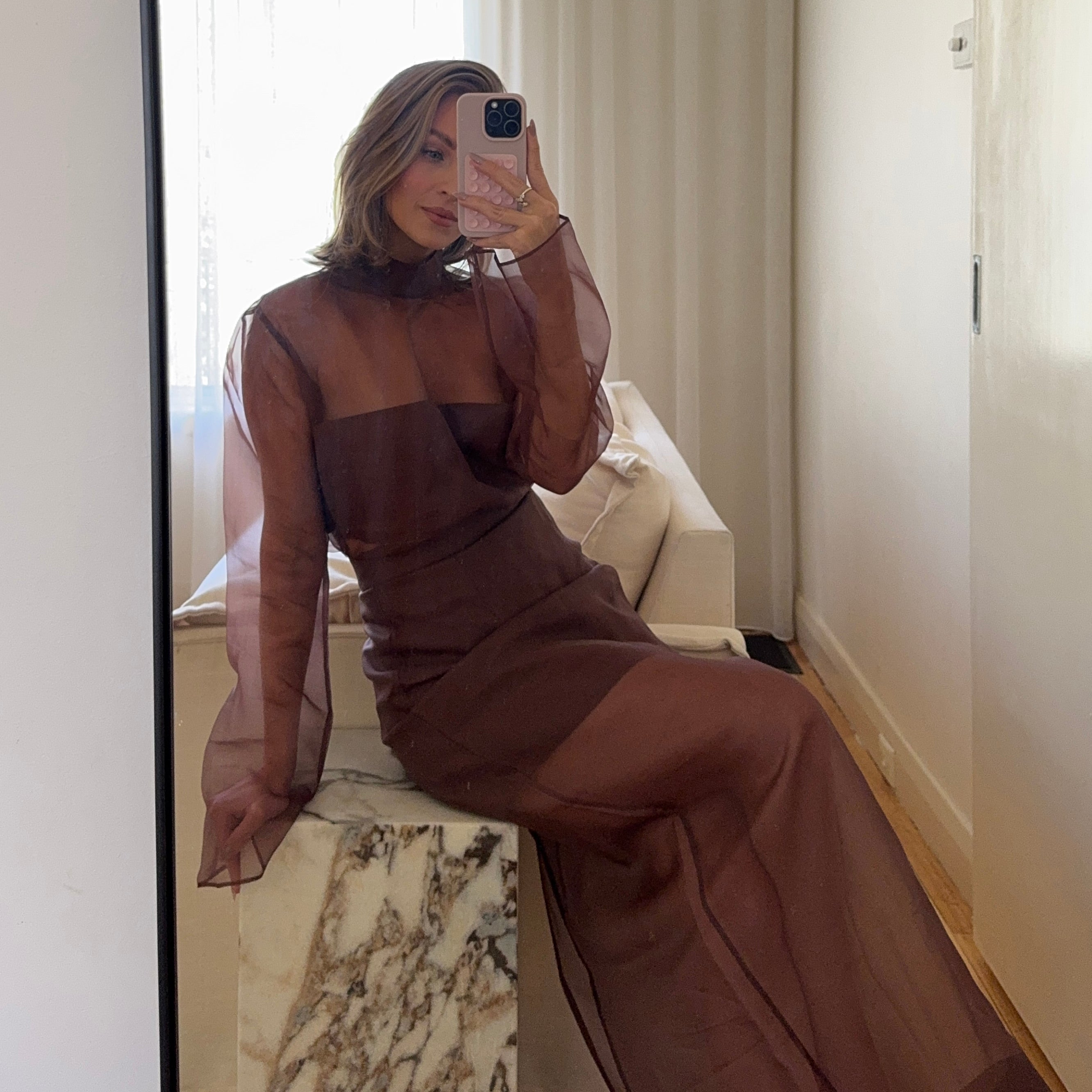 A winter-ready take on our best-selling Sheer Tank, this long sleeve top is crafted from 100% silk organza in a warm Rich Cacao hue. Featuring a high neckline, bell-shaped sleeves, and an internal cotton bodice panel for subtle coverage, it offers a refined, effortless silhouette.