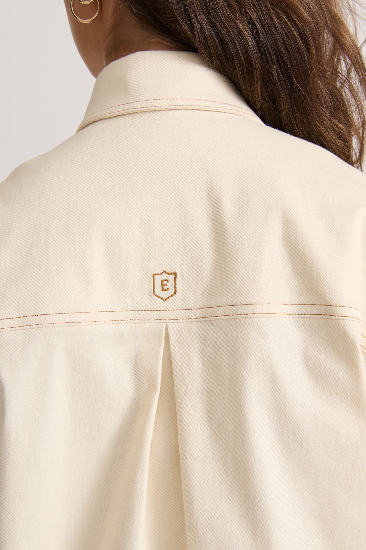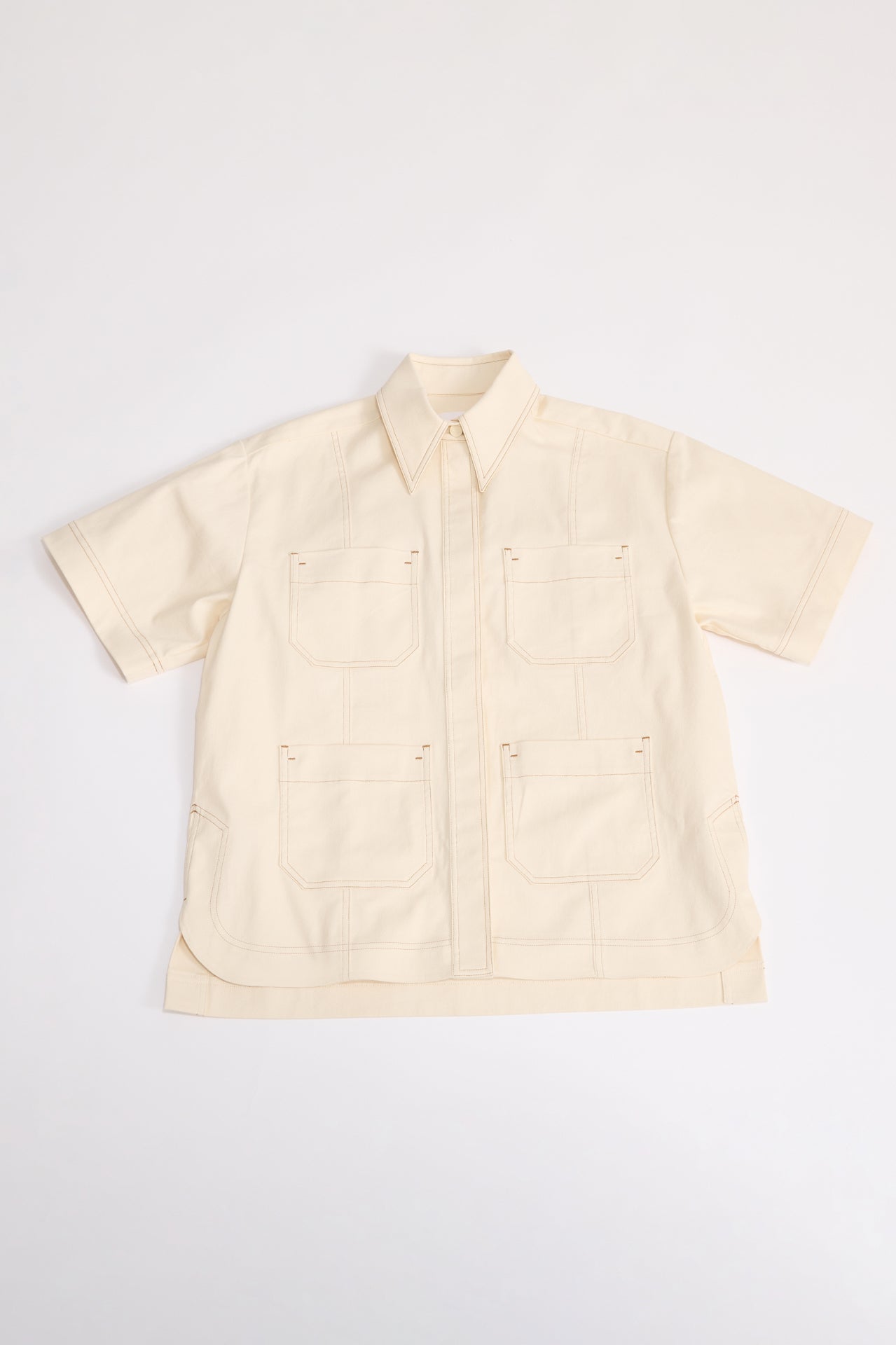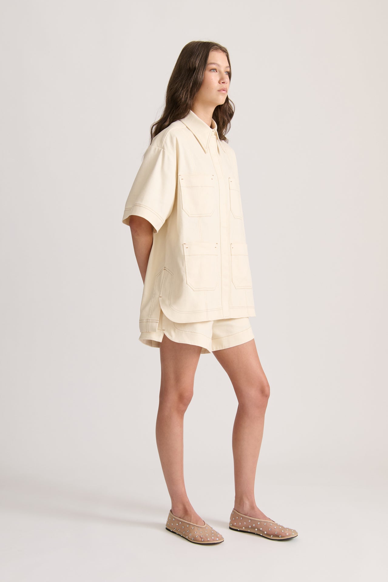 The Short Sleeve Denim Shirt in Crema offers a contemporary update to your classic denim staples. Designed for an oversized, boxy fit, it features front pockets and contrast topstitching for added detail, while the curved front hem and square-cut back bring a modern touch. Style with the Cruise Short for harmonious proportions.