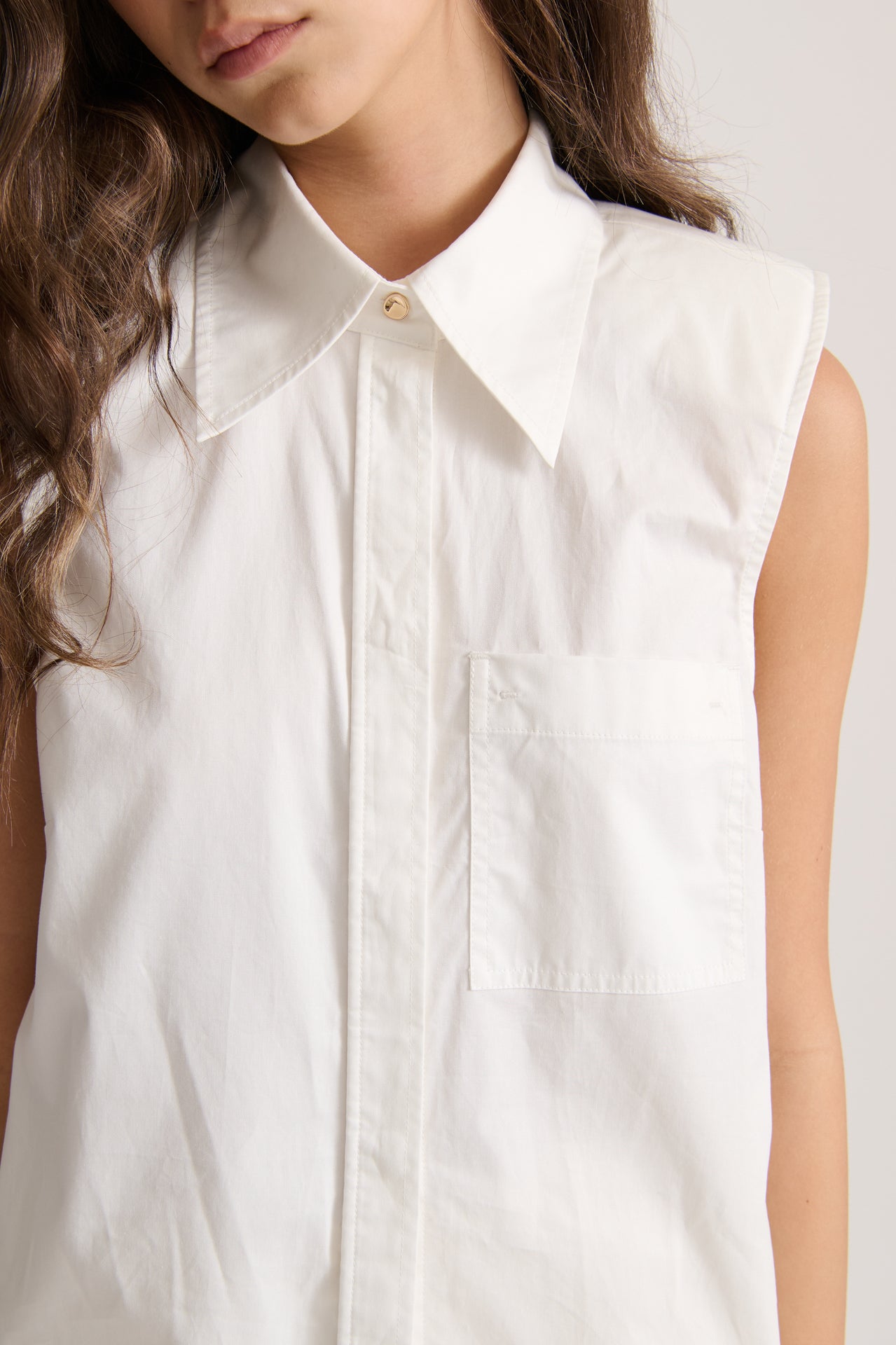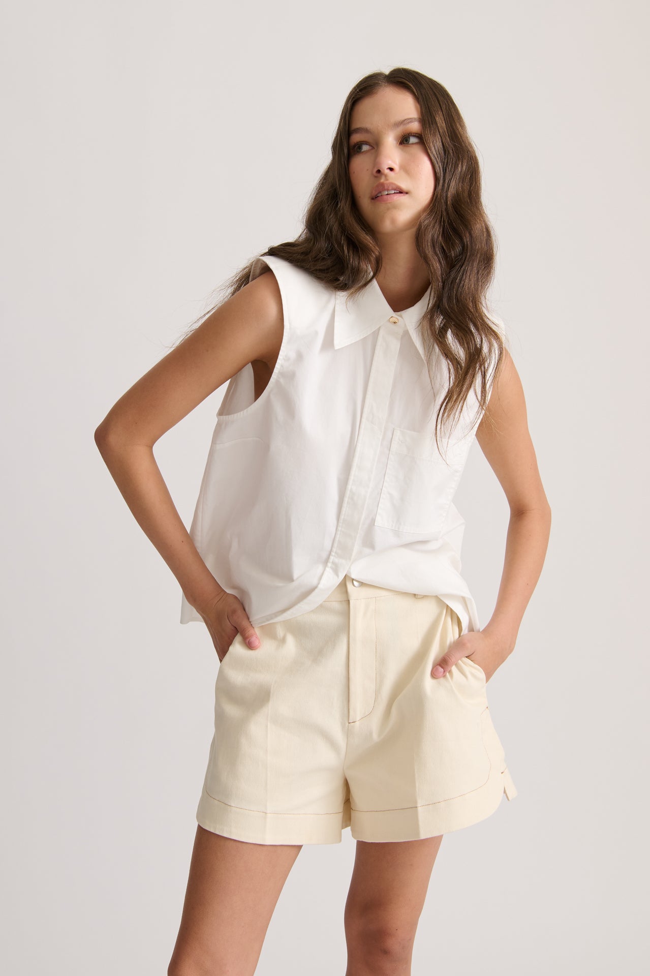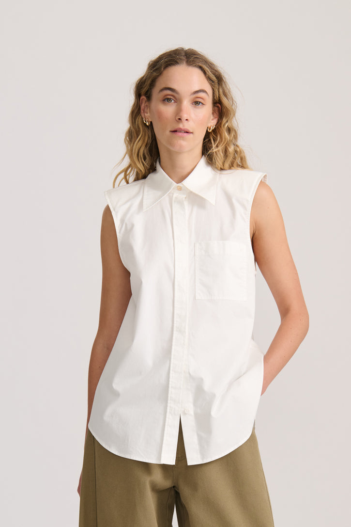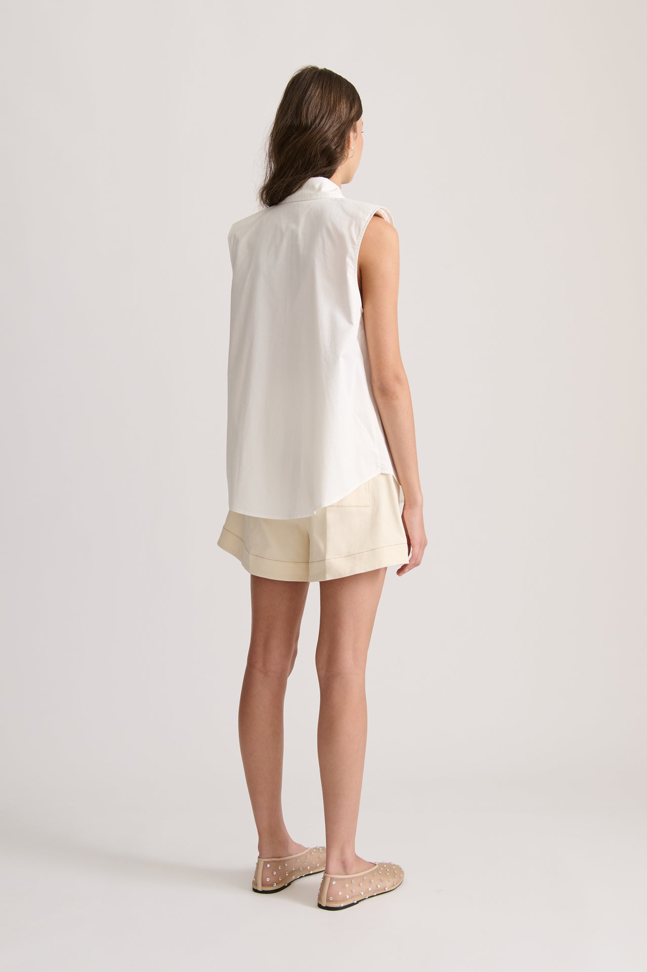 The Sleeveless Shirt in White offers a refined balance of oversized proportions and sharp tailoring. Crafted from 100% cotton, it features an exaggerated collar accented by Emerson Studios' signature gold pebble button, while shoulder pads lend structure and sophistication. Style with the Cruise Short or Pant for everyday polish.