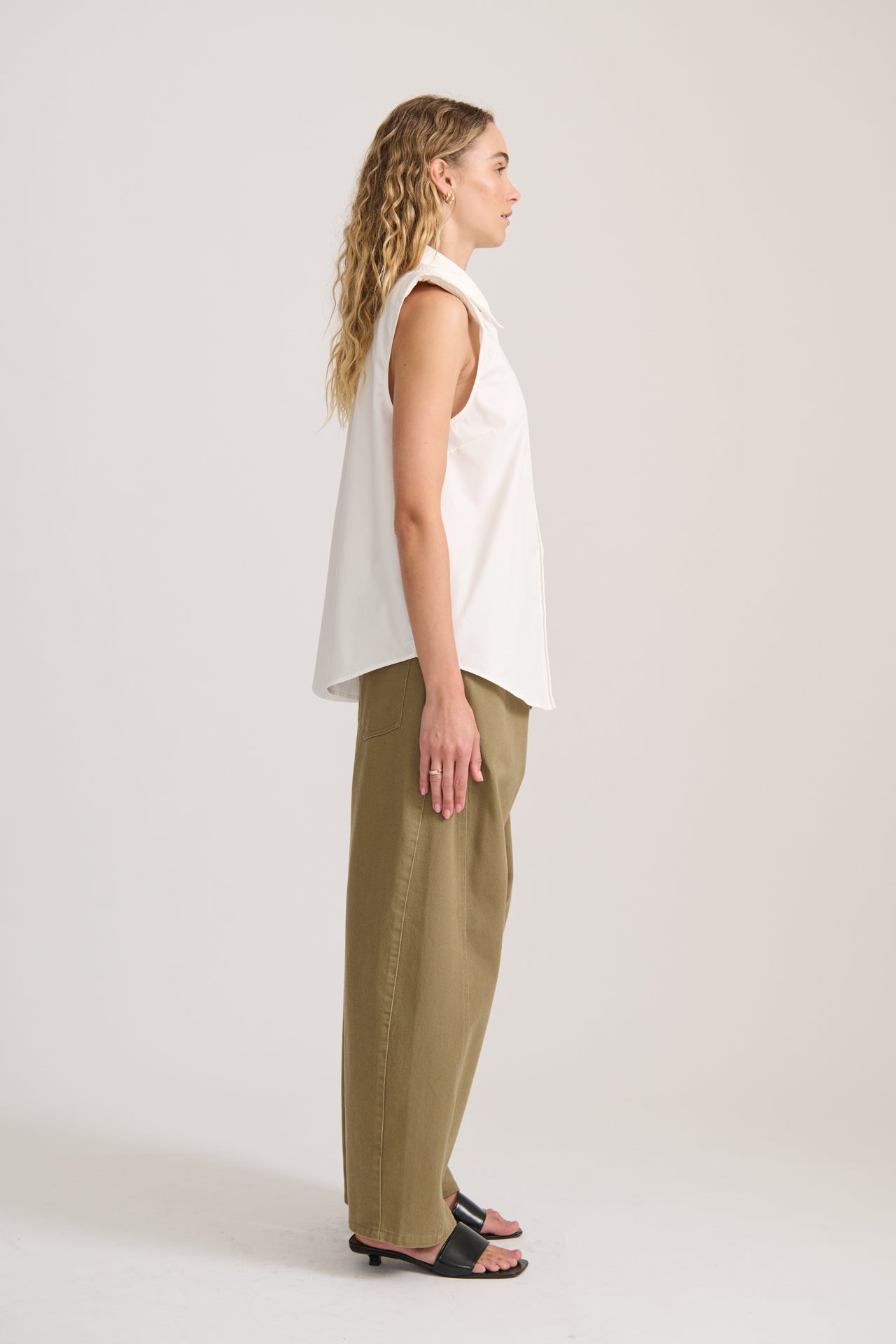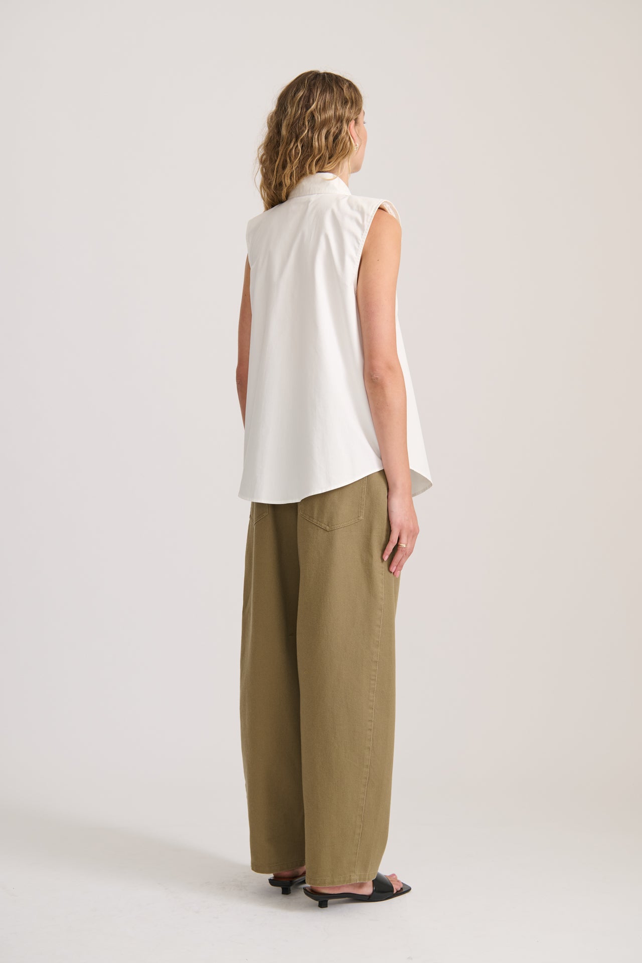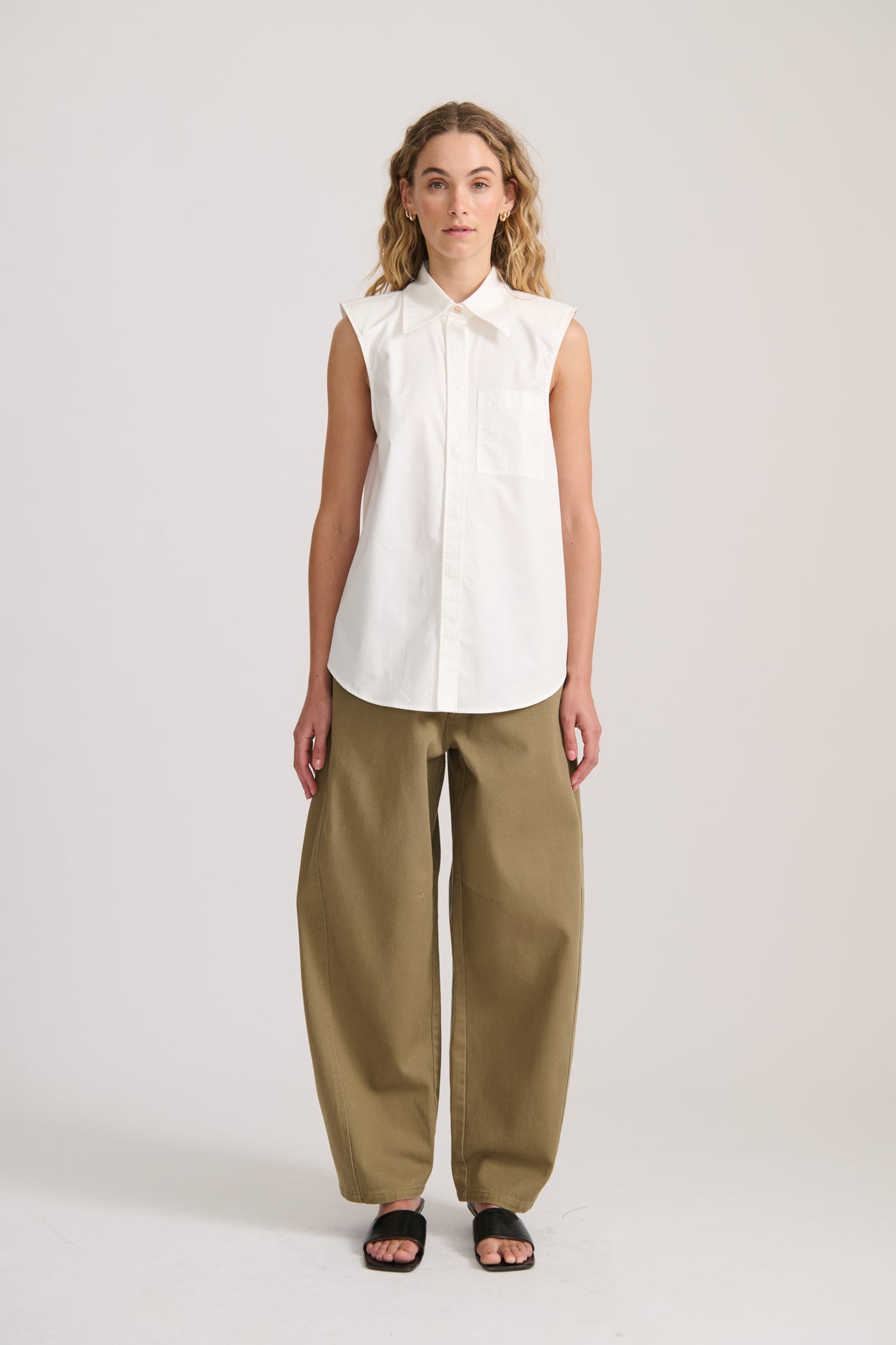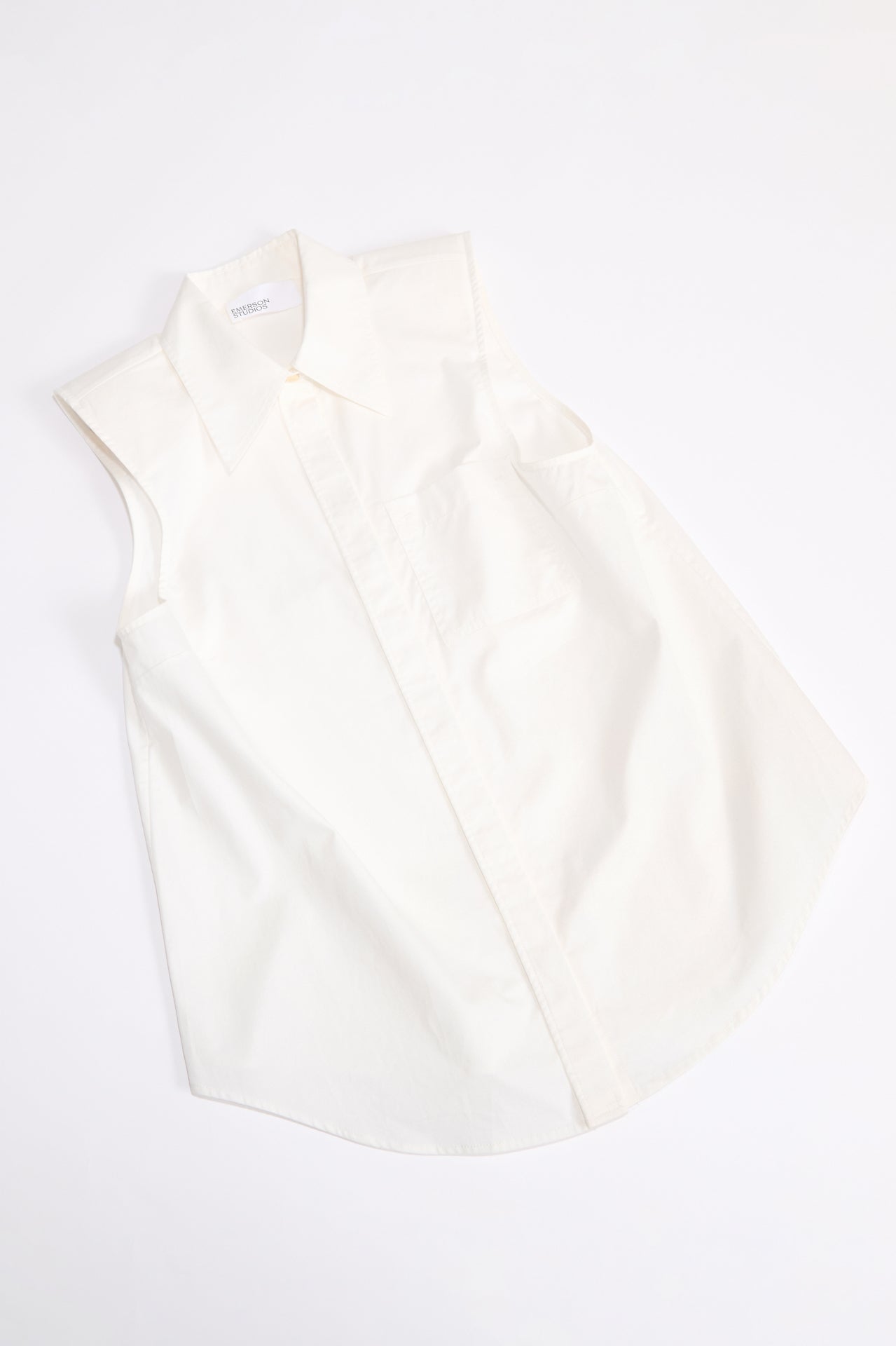 The Sleeveless Shirt in White offers a refined balance of oversized proportions and sharp tailoring. Crafted from 100% cotton, it features an exaggerated collar accented by Emerson Studios' signature gold pebble button, while shoulder pads lend structure and sophistication. Style with the Cruise Short or Pant for everyday polish.