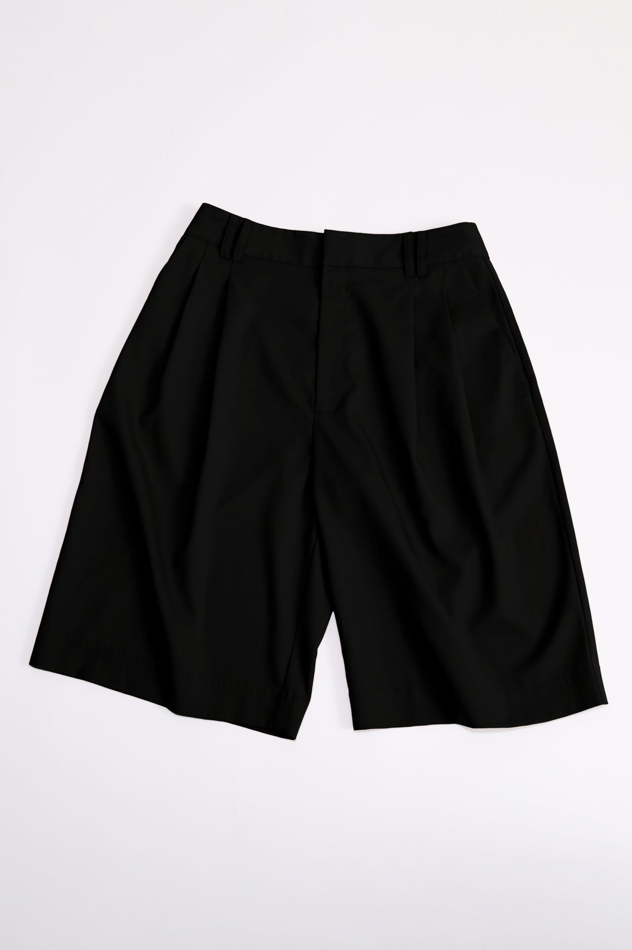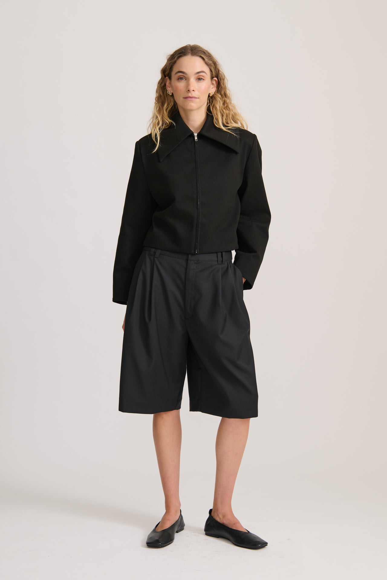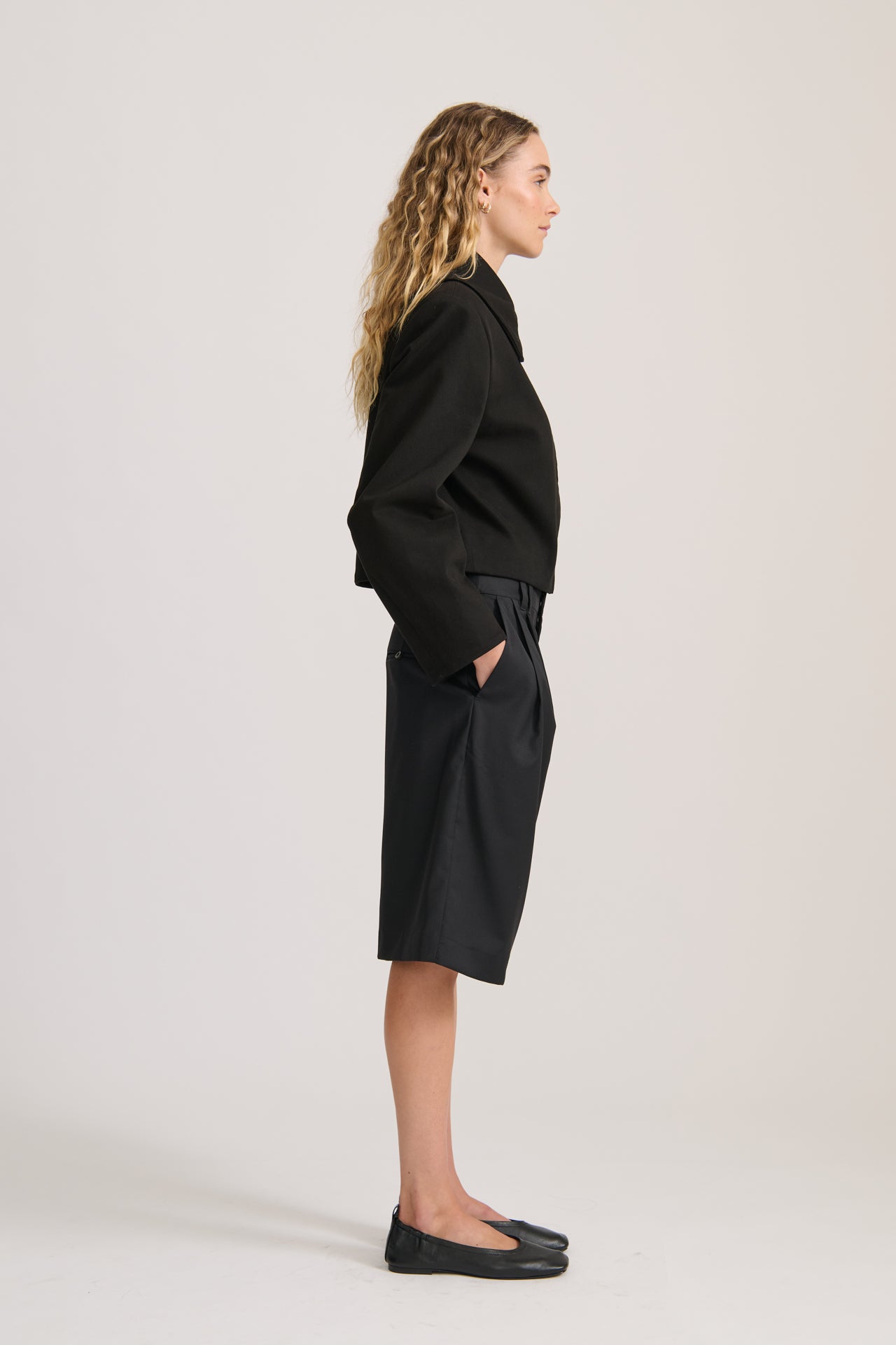 Tailored from a luxurious wool blend, the Bermuda Short in Black balances polished style with laidback appeal. Featuring front pleats to enhance the relaxed silhouette, these mid-rise shorts add a refined edge to summer outfitting. Wear yours with the  Sheer Shirt and Knit Bralette.