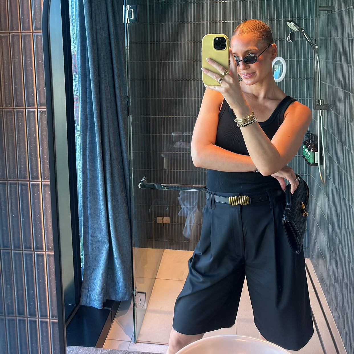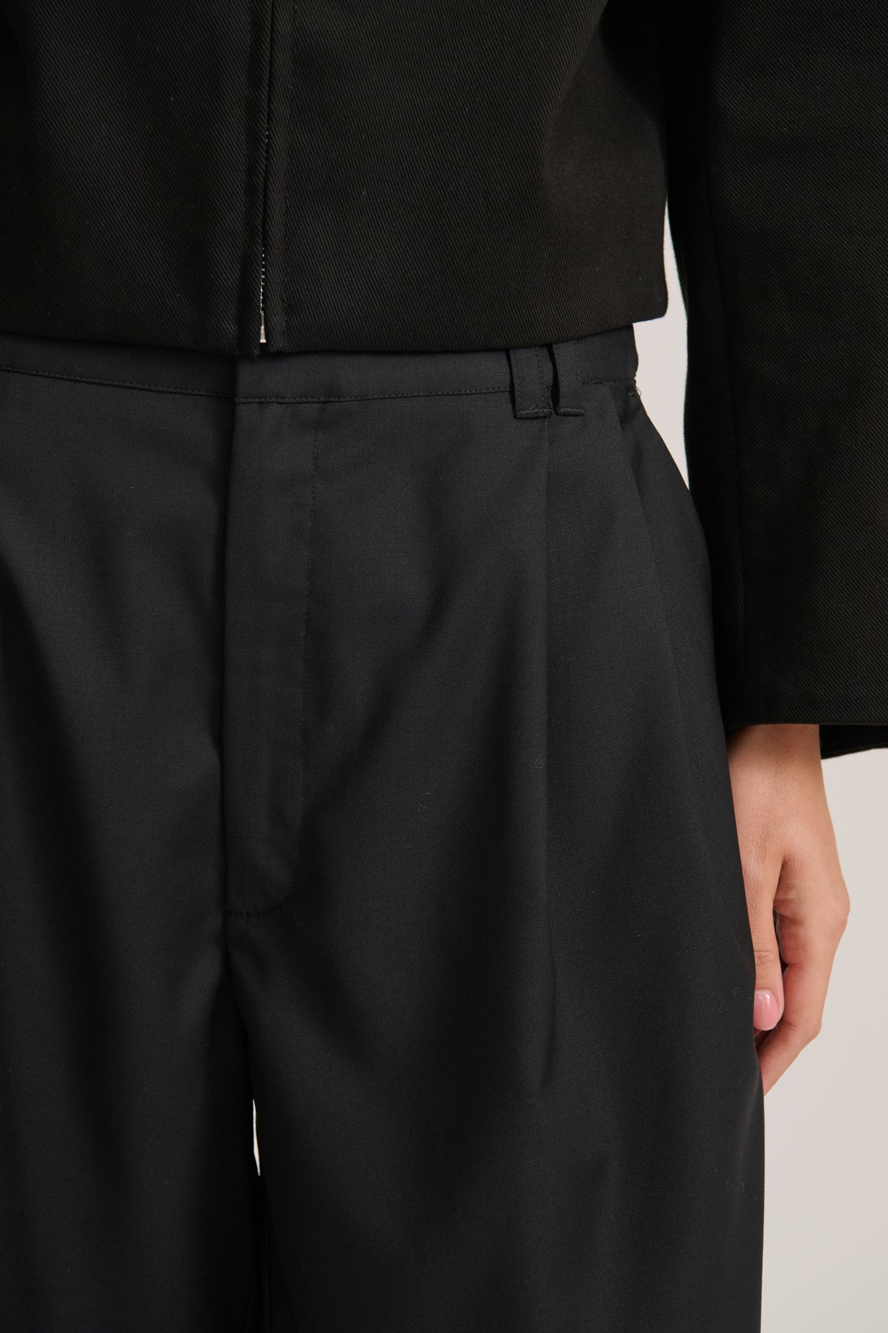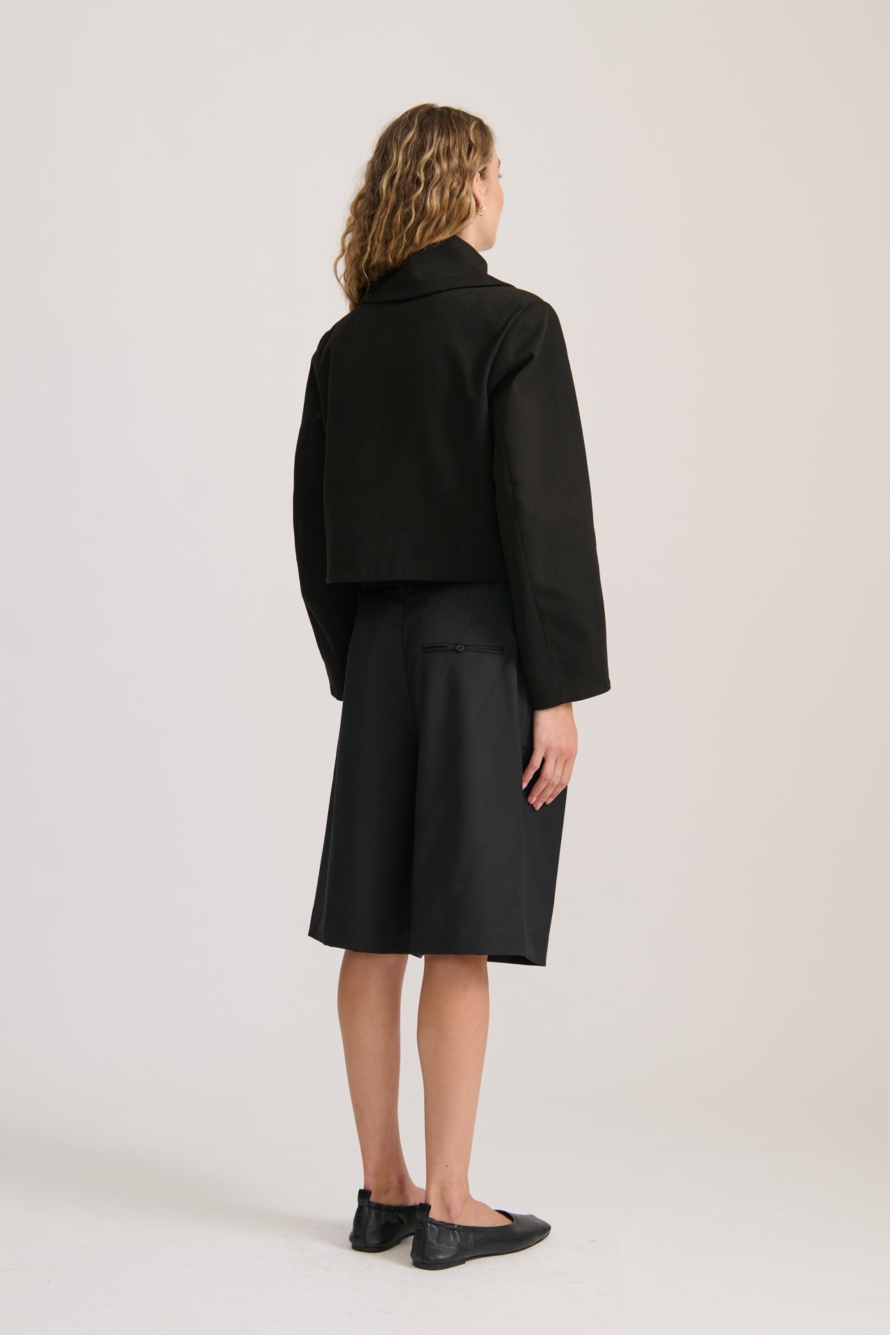 Tailored from a luxurious wool blend, the Bermuda Short in Black balances polished style with laidback appeal. Featuring front pleats to enhance the relaxed silhouette, these mid-rise shorts add a refined edge to summer outfitting. Wear yours with the  Sheer Shirt and Knit Bralette.