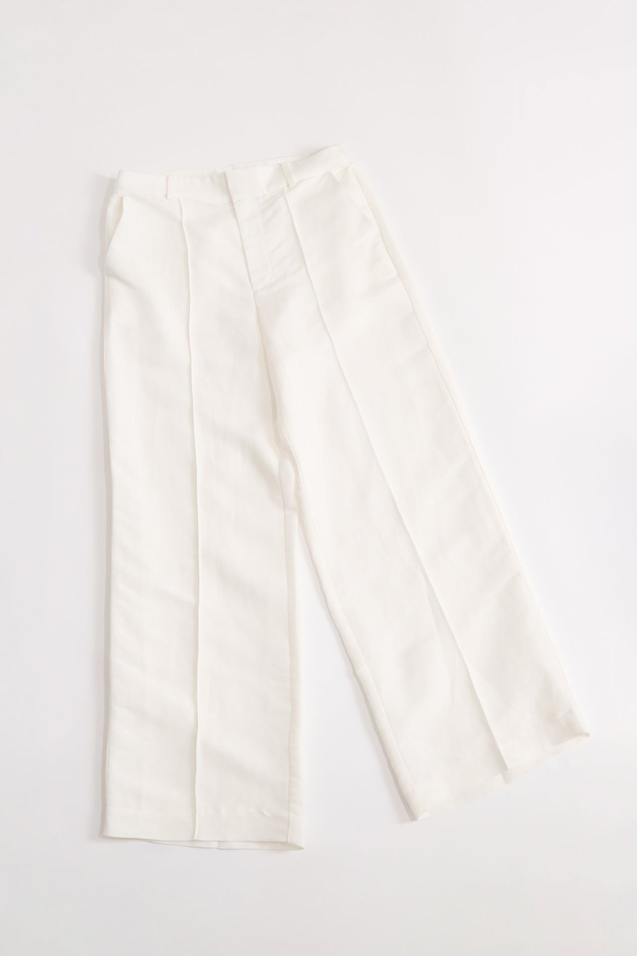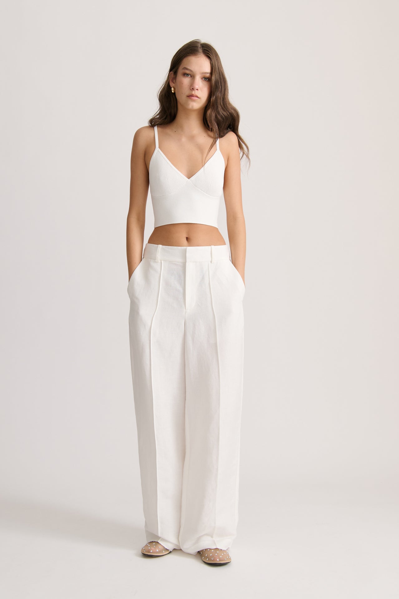 Cut from a mid-weight linen blend, the Cruise Pant in White spells effortless elegance. Sitting high on the waist, this impeccably tailored full-length pant flows into a relaxed wide-leg silhouette, enhanced by crisp front pintuck detail. Elevate your look with the Knit Bralette and Sleeveless Shirt.