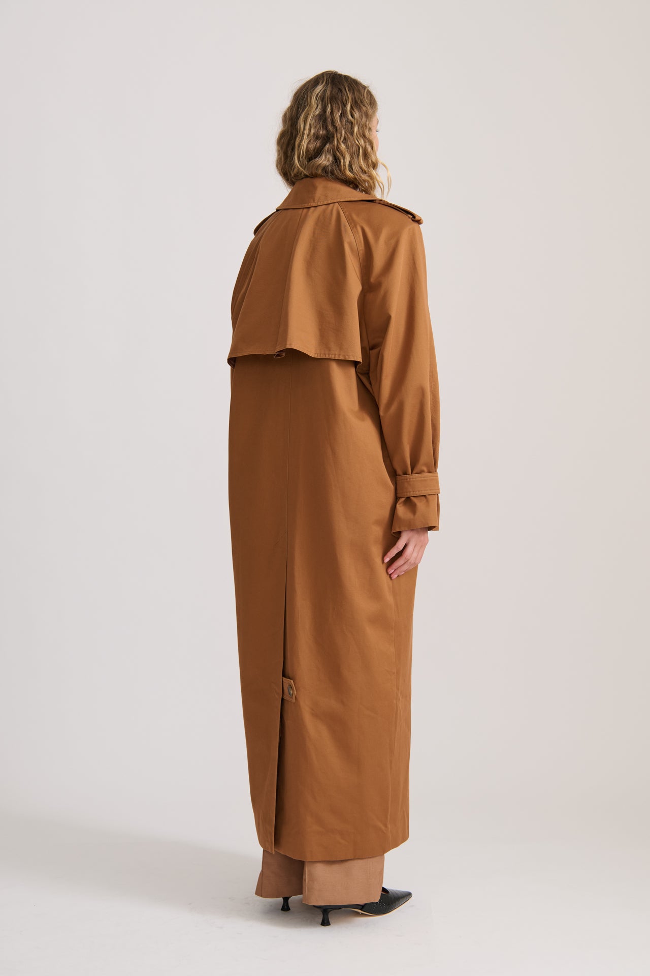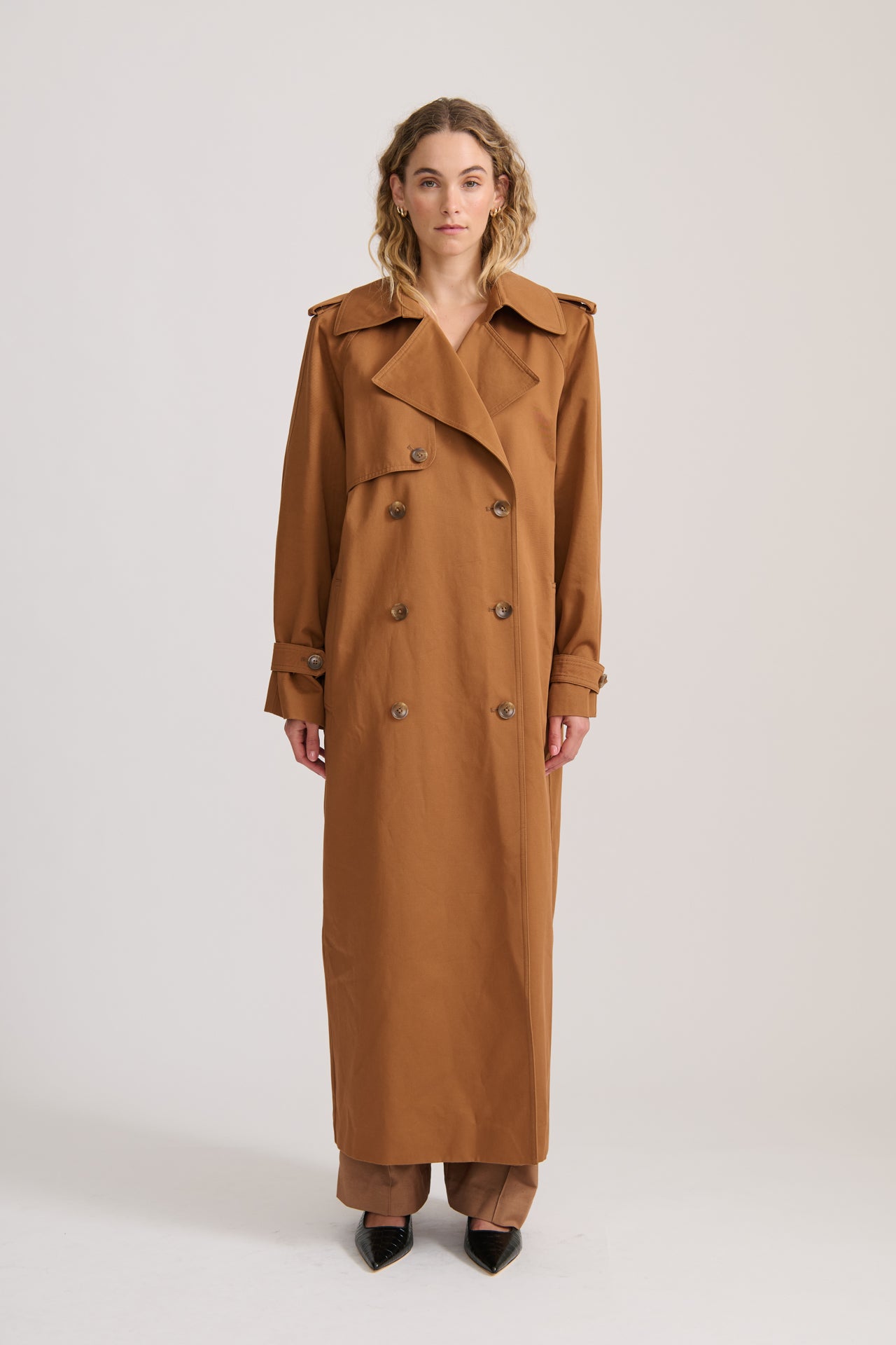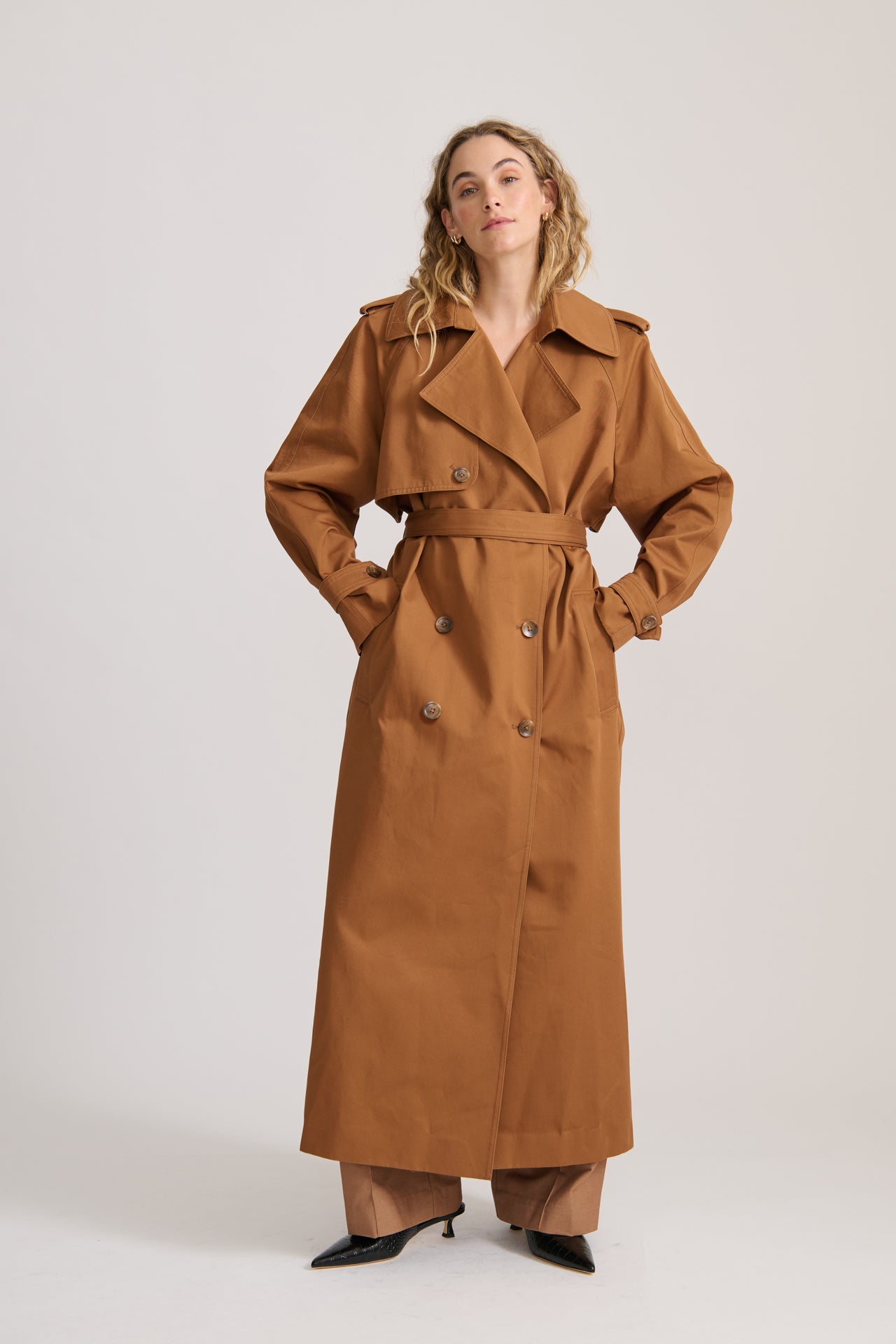 A timeless outerwear staple, the Double Breasted Trench is crafted from structured cotton twill for effortless layering. Designed with a double-breasted silhouette, its dropped shoulders and maxi length create a relaxed yet refined fit. A detachable belt cinches the waist for versatile styling, while the flat pockets and back pleat enhance movement and functionality. Thoughtful details, including an embroidered back-neck collar and Emerson Studios’ signature craftsmanship, elevate this classic piece. Secured with three front buttons, it's an essential for cool-weather dressing. Layer over tailoring or knitwear for an understated, sophisticated look.
