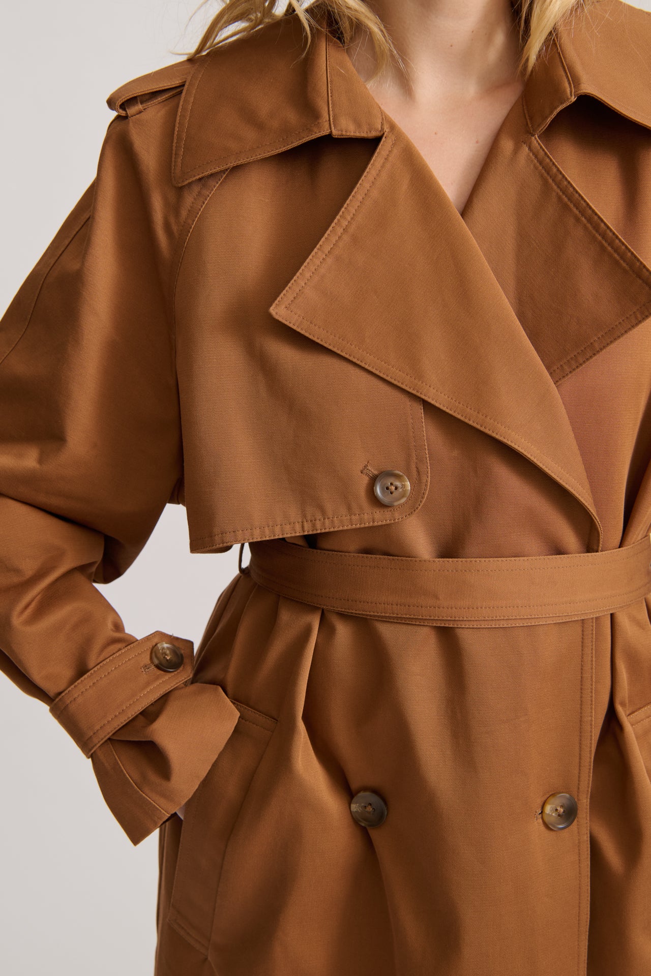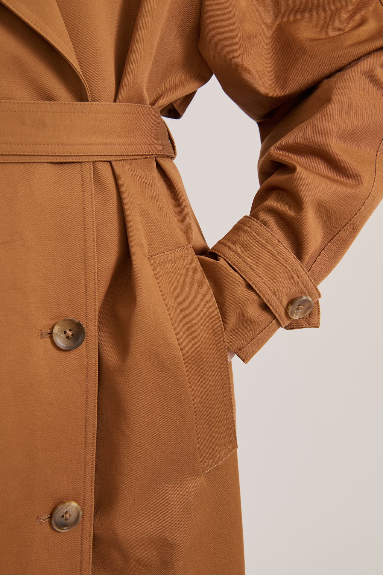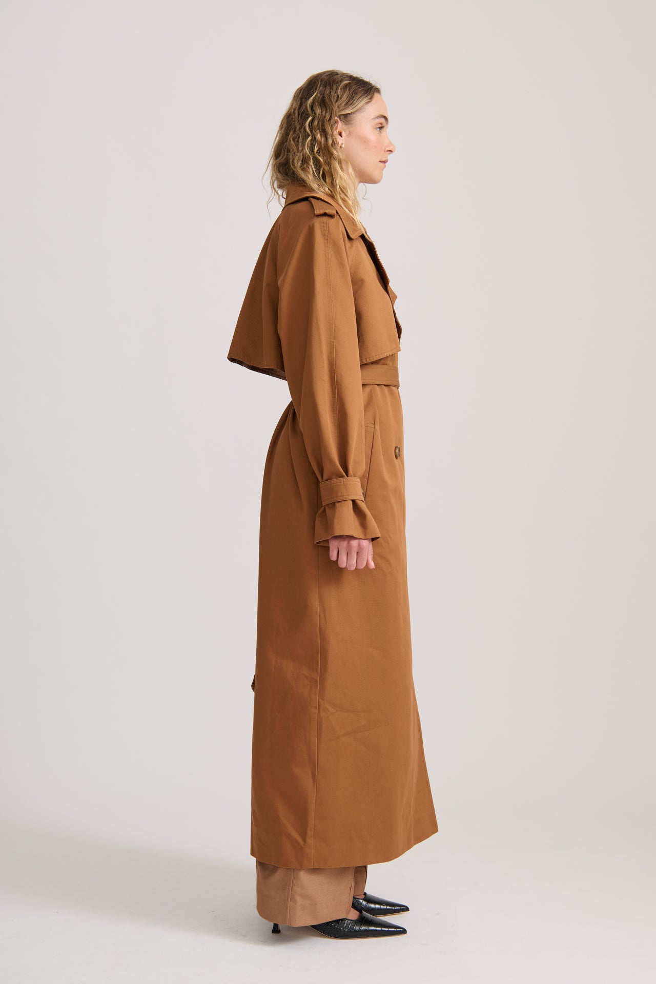 A timeless outerwear staple, the Double Breasted Trench is crafted from structured cotton twill for effortless layering. Designed with a double-breasted silhouette, its dropped shoulders and maxi length create a relaxed yet refined fit. A detachable belt cinches the waist for versatile styling, while the flat pockets and back pleat enhance movement and functionality. Thoughtful details, including an embroidered back-neck collar and Emerson Studios’ signature craftsmanship, elevate this classic piece. Secured with three front buttons, it's an essential for cool-weather dressing. Layer over tailoring or knitwear for an understated, sophisticated look.