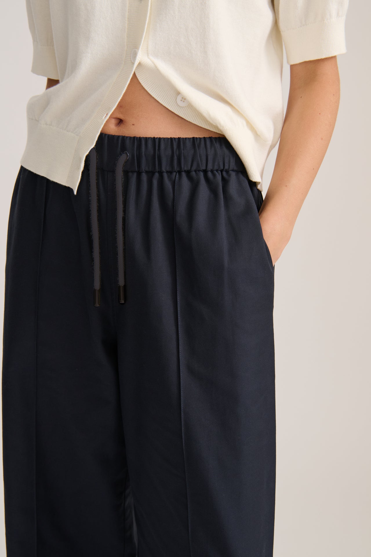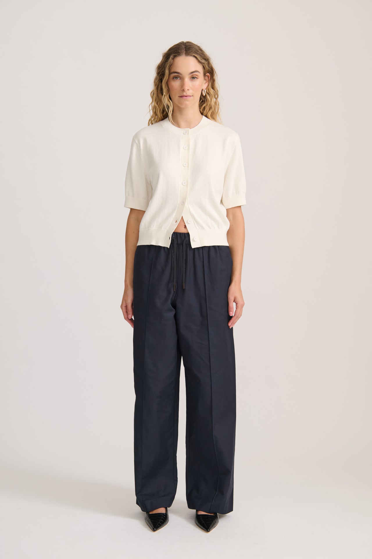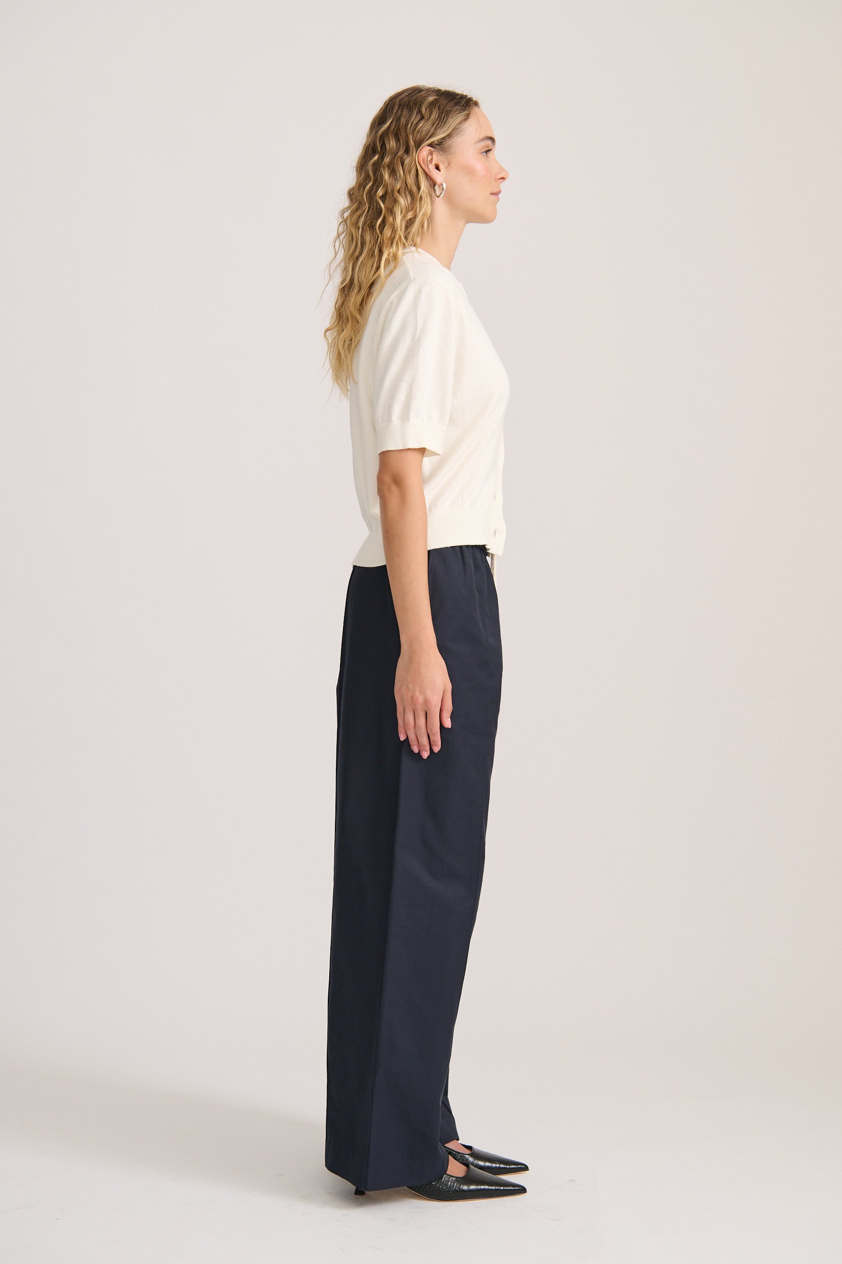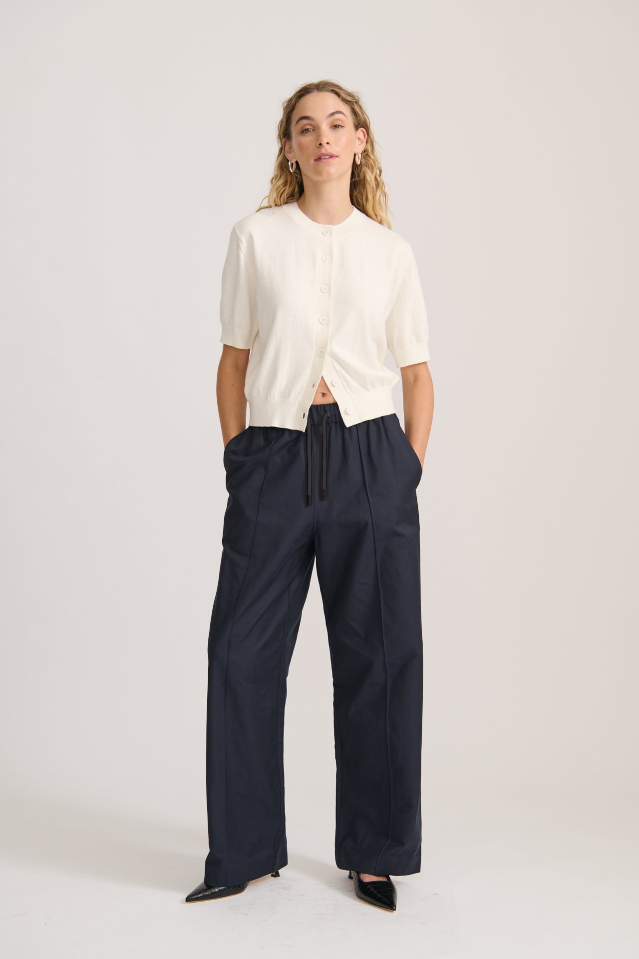 The Everyday Pant in Navy blends effortless style with everyday comfort. Designed for versatility, this full-length pant features a relaxed straight-leg fit with a refined pin-tuck detail running through the center. The adjustable drawcord waist allows for a customisable fit, while side entry pockets add practicality. Crafted from a premium polyester-cotton blend, these pants offer a soft feel with lasting durability—perfect for both casual and elevated dressing.