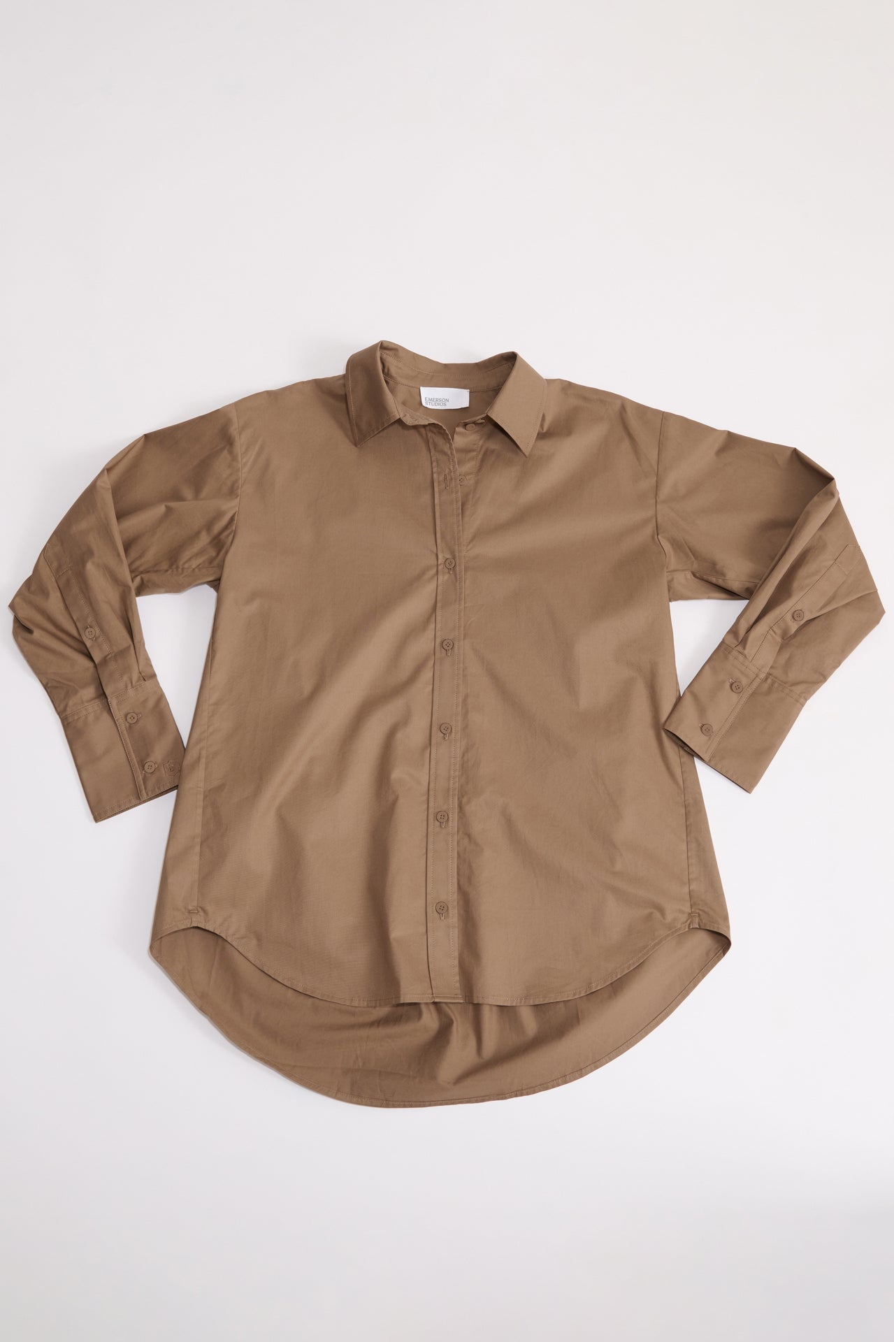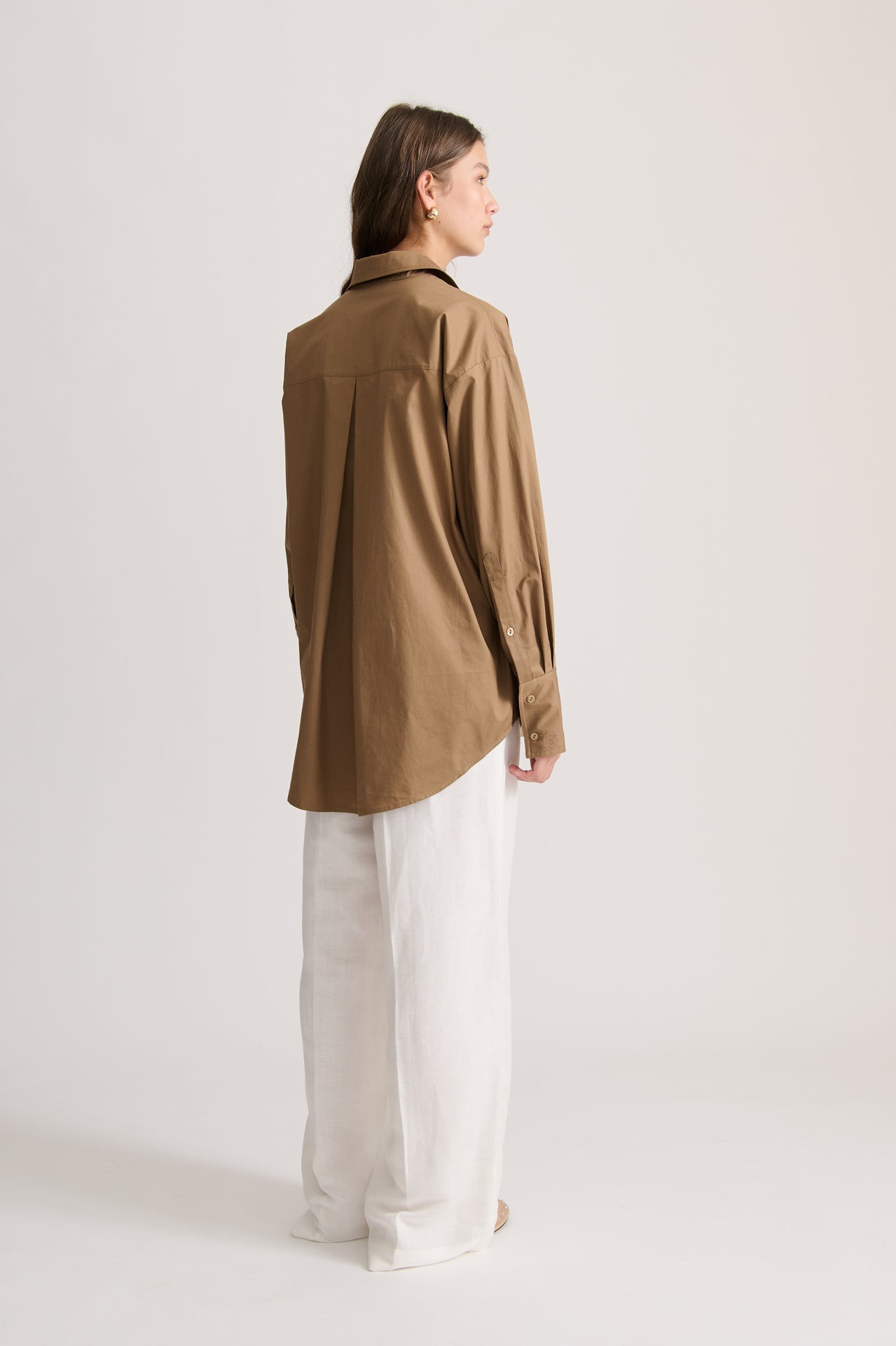 The Poplin Shirt in Frappe is a year-round wardrobe staple, crafted from 100% cotton in a versatile brown hue. Featuring intricate topstitching, branded buttons and embroidered cuffs. Wear it buttoned up or layered open over the Knit Bralette for polish and ease.